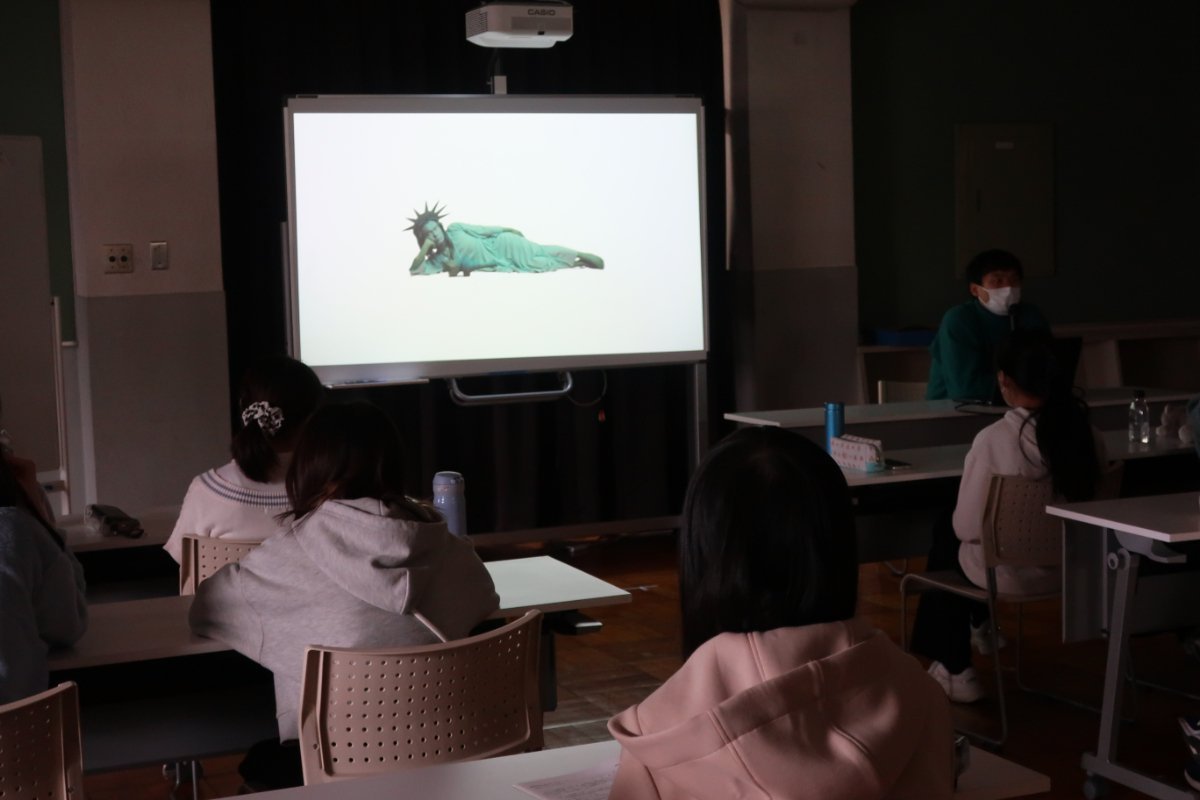当日は、潘さんの自己紹介からスタート。高校生の頃に描いた自画像から、現在に至るまでの作品を紹介します。中には、潘さん自身が「自由の女神」に扮し、涅槃像のポーズをとる映像作品も。自分の身体も表現するための道具です。