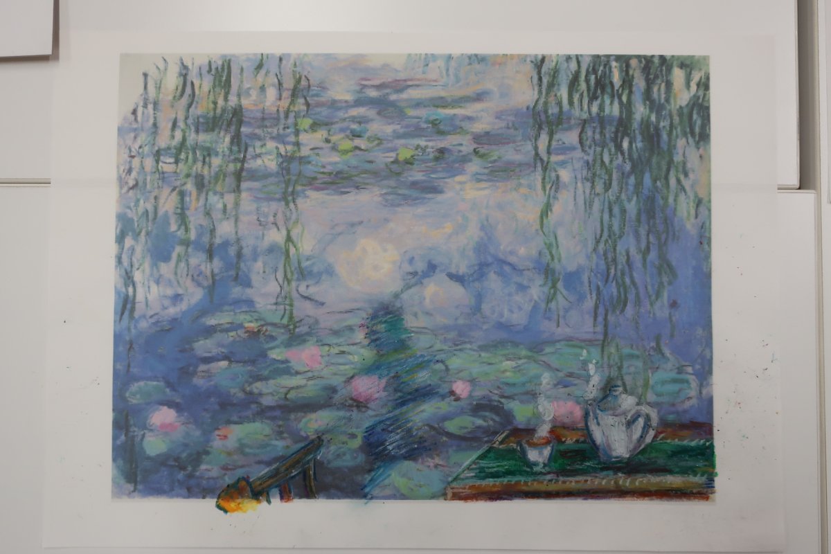 クロード・モネによる睡蓮の絵には、ポットとカップに入ったお茶が描き加えられ、居心地の良さそうな絵が出来上がりました。