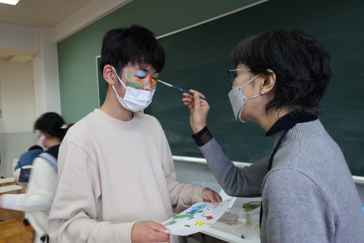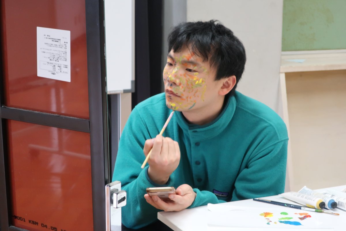 制作時間中、おもむろに潘さんが始めたのは、自分の顔をカンヴァスにした点描画。ボディペインティング用の絵具を使って顔に描いていきます。実は実施場所となった会場には、東京シューレ葛飾中学校ができる以前からこの場所にあったという作者不明の点描画作品が3点展示されています。