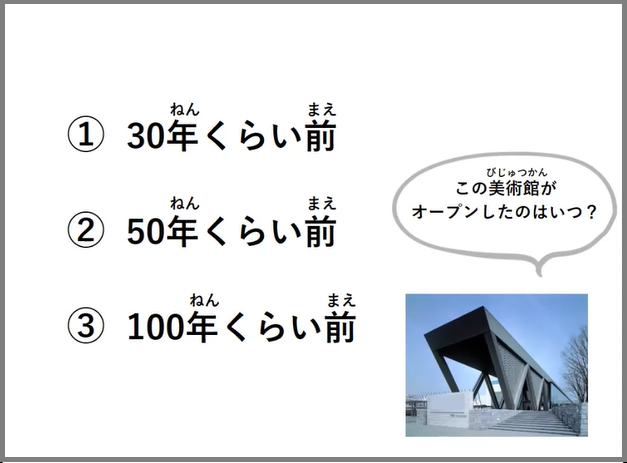 教育普及係からプログラム中の注意事項などをお伝えした後、いよいよプログラムが始まります。まず、「美術館ってどんなところ?」という問いかけからスタートです。