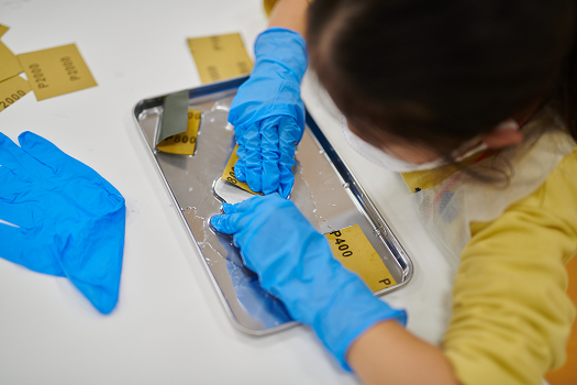 磨き作業の説明を受けたら、まずは紙ヤスリ(主に#800・1000・2000)を使って段階的に水磨きをしていきます。勝木さんからは、「色々な方向からの傷がつくのがきれいに光るコツ。真ん中は手が入りやすいので、端の方に意識を向けて磨くとまんべんなくきれいに光ります」とのアドバイスがありました。部屋の中にはシャカシャカシャカ…という磨きの音が静かに響いています。「手が疲れた~」という声も聞かれましたが、一休みしながら皆さんは黙々と作業を続けていきました。