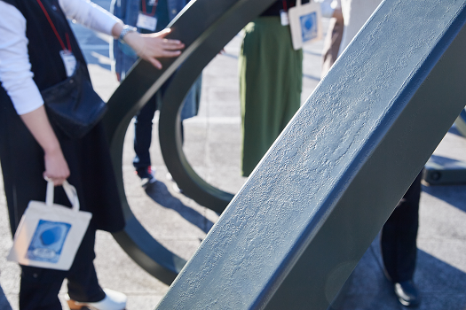 初めに、勝木さんが抽象彫刻の道に進んだ経緯などについて自己紹介がありました。学生時代に取り組まれていた具象彫刻から近年の抽象彫刻までの変遷を辿り、「(抽象彫刻に対して)鑑賞者によって感じることや捉え方が違うこと、磨くと光る金属にその場の景色や鑑賞者が映り込むことに面白さを感じました。自分が作品を作るときにも、作品と鑑賞者との間で対話が生まれるように意識しています」とのコメントがありました。
