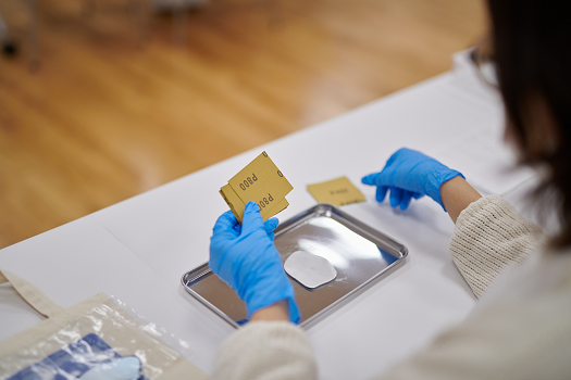 アルミの表面が鏡のようになってきたところで鑑賞の時間です。参加者が磨いたアルミ作品を並べ、それらの表情の違いを見比べながら、約1時間磨き続けた成果を全員で鑑賞しました。磨く前は曇っていた表面が、今や自分たちの顔が映るほどピカピカになった様子に、参加者の皆さんは達成感や喜びが入り混じったような晴れやかな表情をされていました。自らが手を動かすことで素材に変化が見られることは、年齢に関係なく作業のモチベーションとなっていたようです。各々がピカピカになったアルミの作品を手に乗せて、愛おしそうに見つめている姿はとても印象的でした。