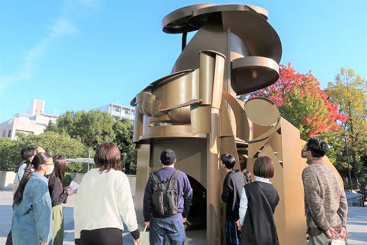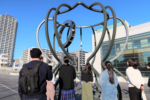 じっくり鑑賞したところで、リチャード・ディーコン《カタツムリのように B》へ場所を移します。この作品は《発見の塔》と同じ鋼に加え、アルミニウムも使用されている作品です。素材ごとの印象の違いなどにも意識を向けながら、いろいろな場所から観察します。
