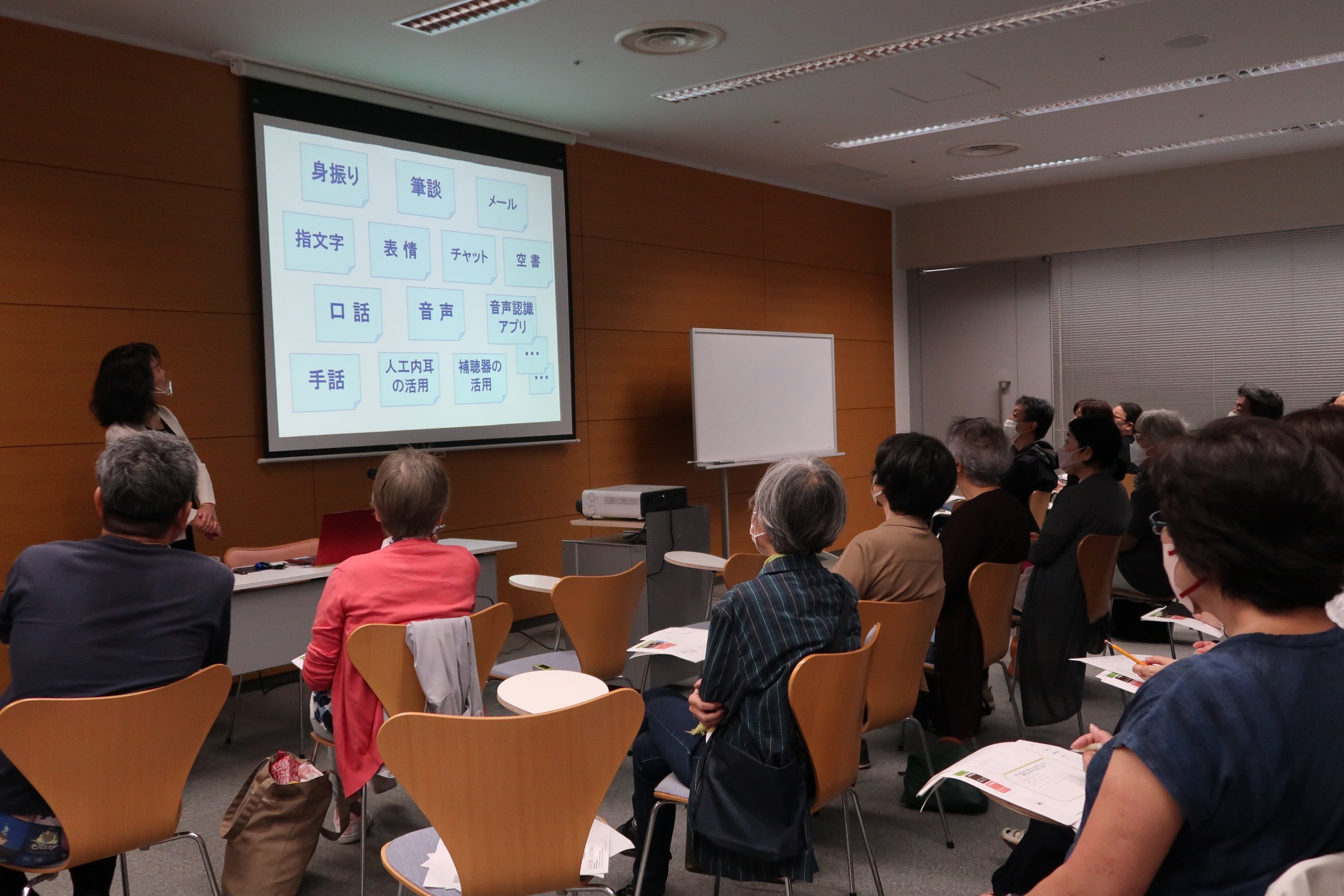 アクセシビリティに関する考えるお話から始まり、聞こえない・聞こえにくい人とのコミュニケーションや手話通訳を介した鑑賞について、ワークを交えながら進行していきました。