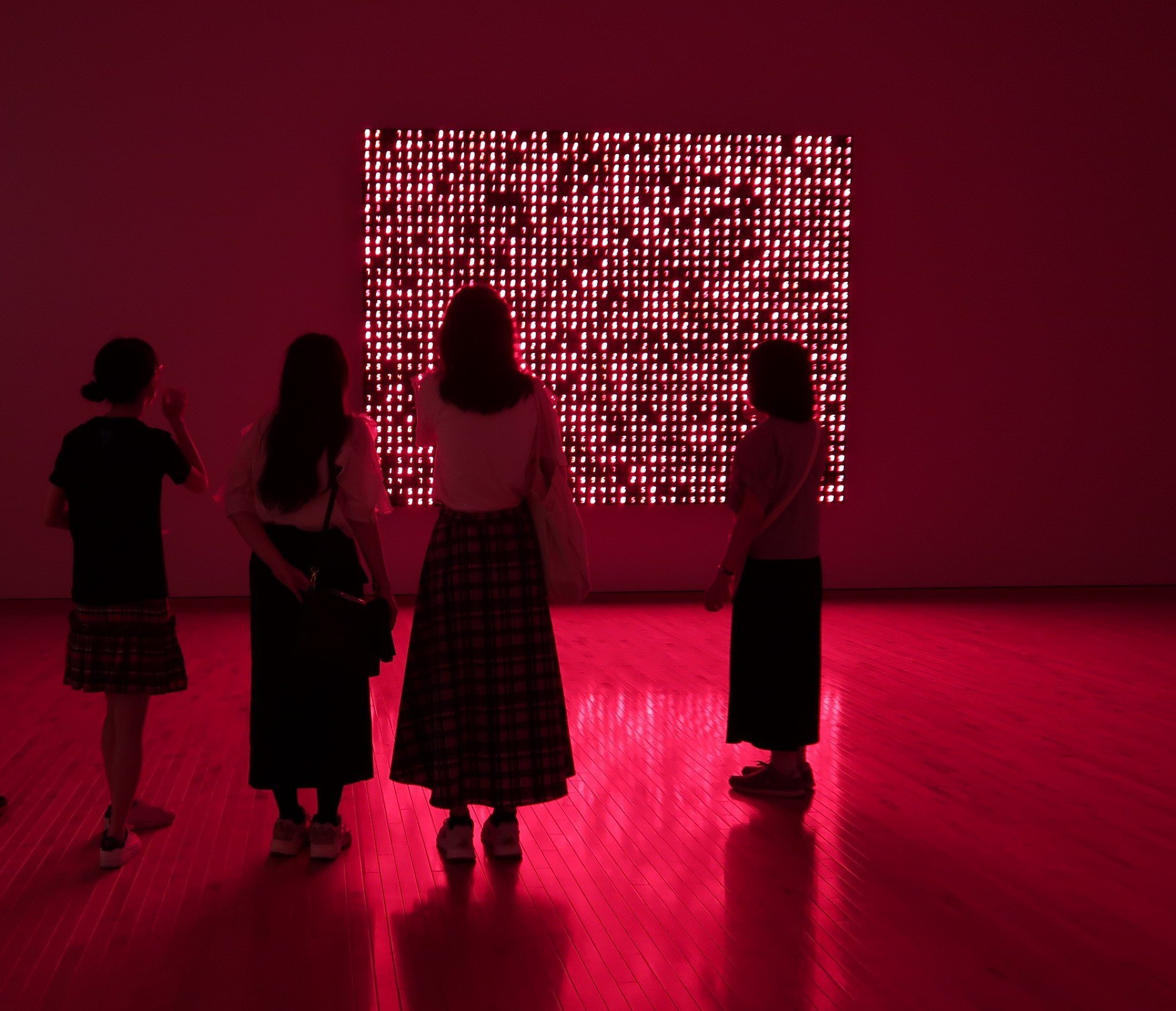 次は宮島達男の展示室へと移動します。出会いのワクワク感を高めるべく、展示室に入る前に、先に二人の生徒さんに偵察をお願いし、作品の様子をジェスチャーで教えてもらうことにしました。