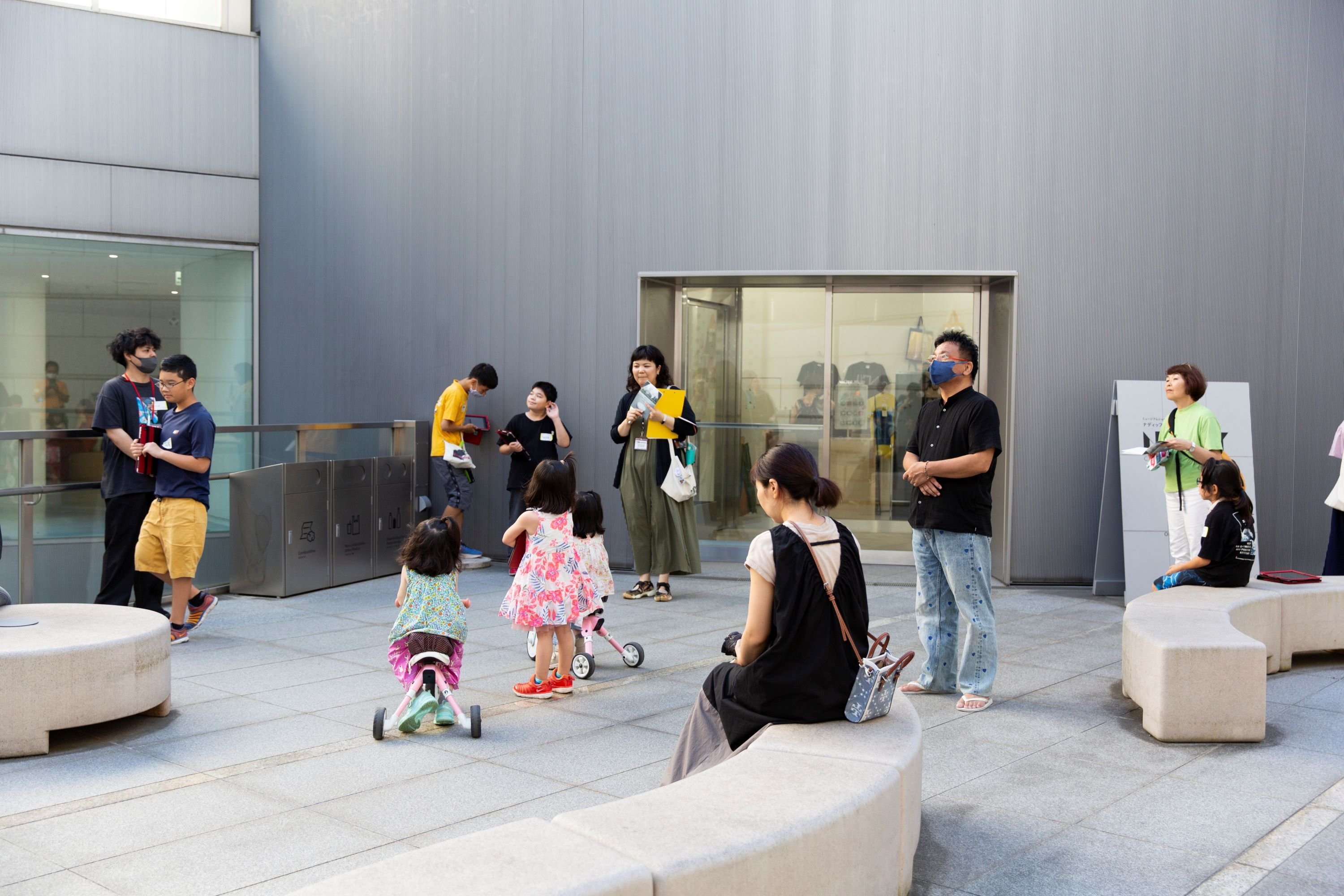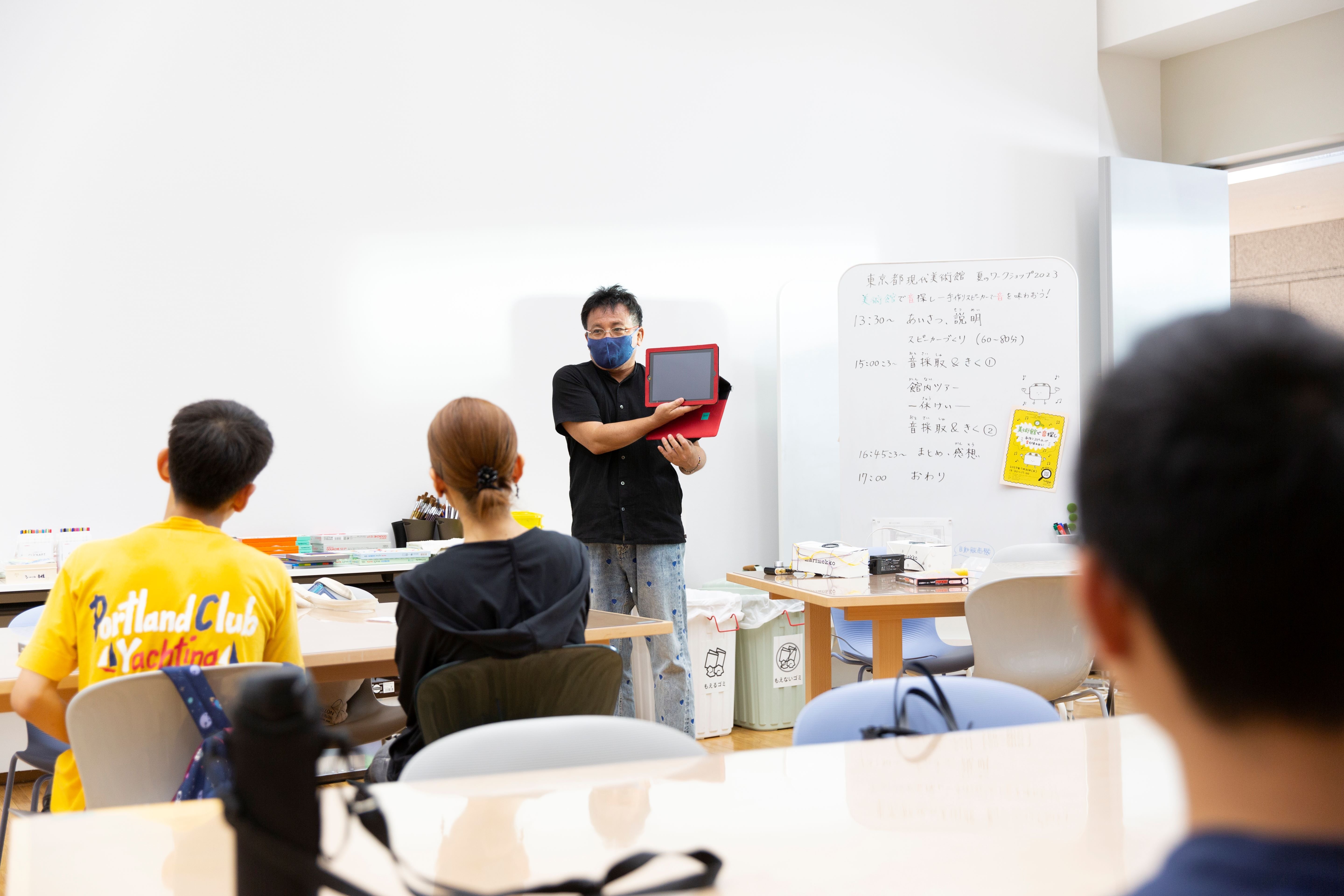 「みんなで美術館の中を歩き回って、美術館の音探しをします。何か面白い音するな、と思ったらこちらのタブレットを使って録音します。例えば、ゴミ箱とかいい音がしそうだったら、コンコンコンとたたいてその音を録ったりして、遊びながら館内をめぐります!」