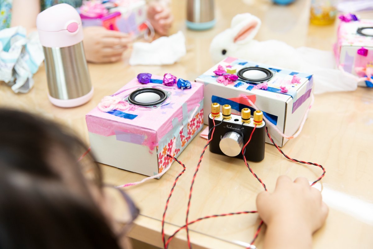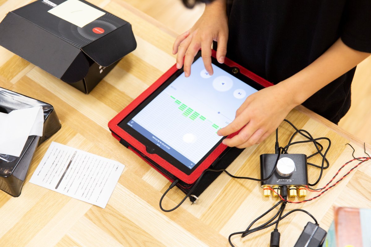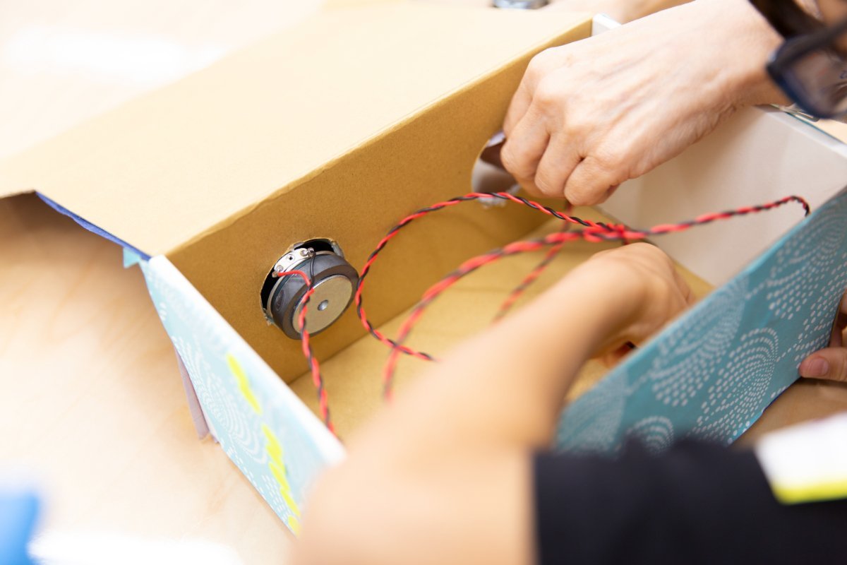 1時間ほどの制作時間を経て箱が出来上がったら、スピーカーユニットをはめ込み、アンプにつなげます。