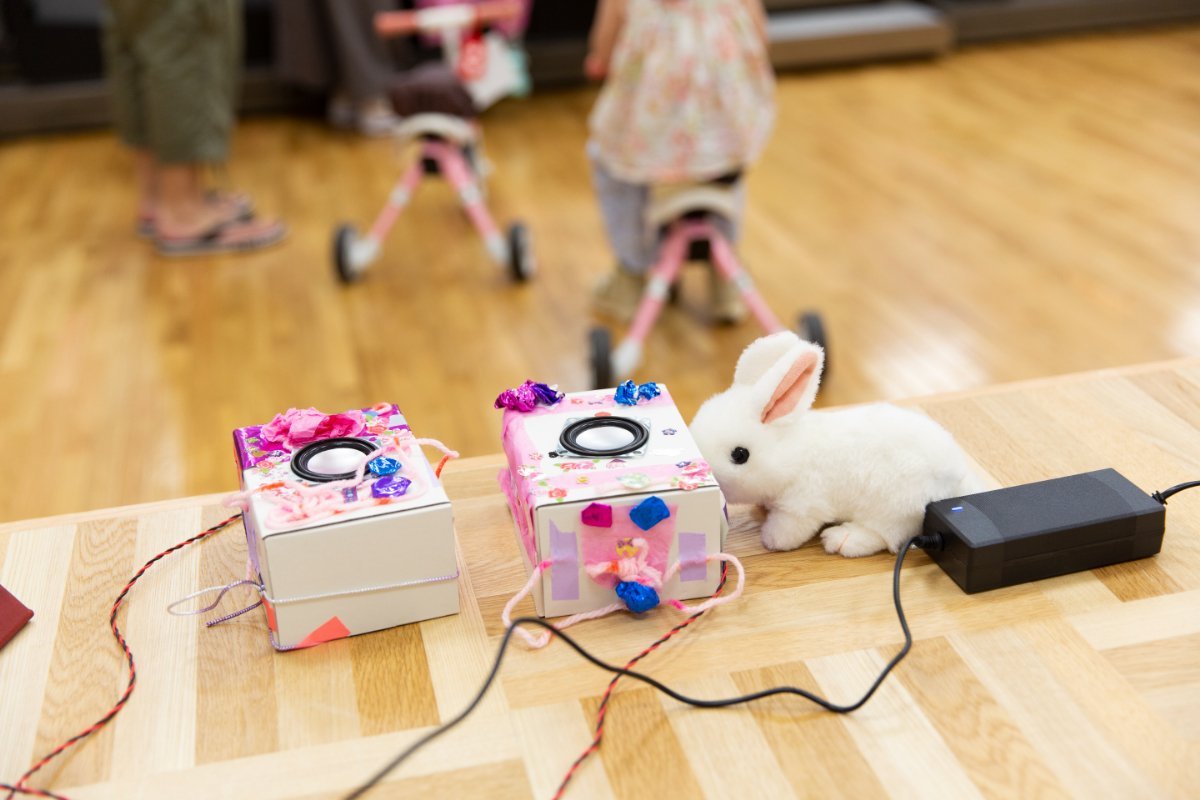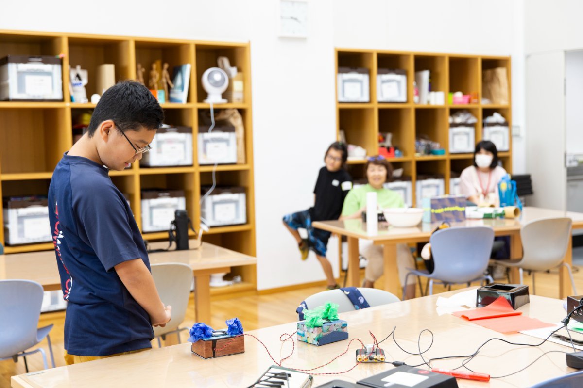 完成したスピーカーは、片岡さんが用意した音源につなげて一人ひとり音の出方を視聴しました。片岡さんが演奏した音楽が流れてくると、思わず身体が動き出す子も!