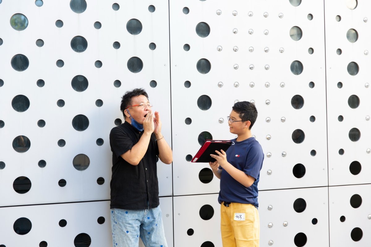 その次に、この場所にある“もの”にも注目。コルクのベンチを使ったり、触るとカタカタっと音がする建物の意匠の一部に触れたりして音採取をしていきます。片岡さんは、高い壁に囲まれたこの場所で声を響かせます。その音も採取!