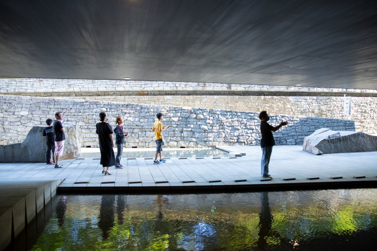 続いて、水と石のプロムナードへと移動。独特の響きが生まれるこの場所では、自分たちの身体を介して音を出したりしました。