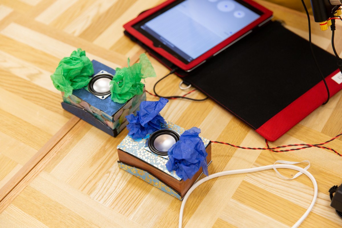 片岡さんによると、スピーカーのベースとなる箱に素材を貼り付けたり、絵具を塗ったりして装飾すると、何も手を加えていない箱よりも良い音が出るようになるのだそうです。