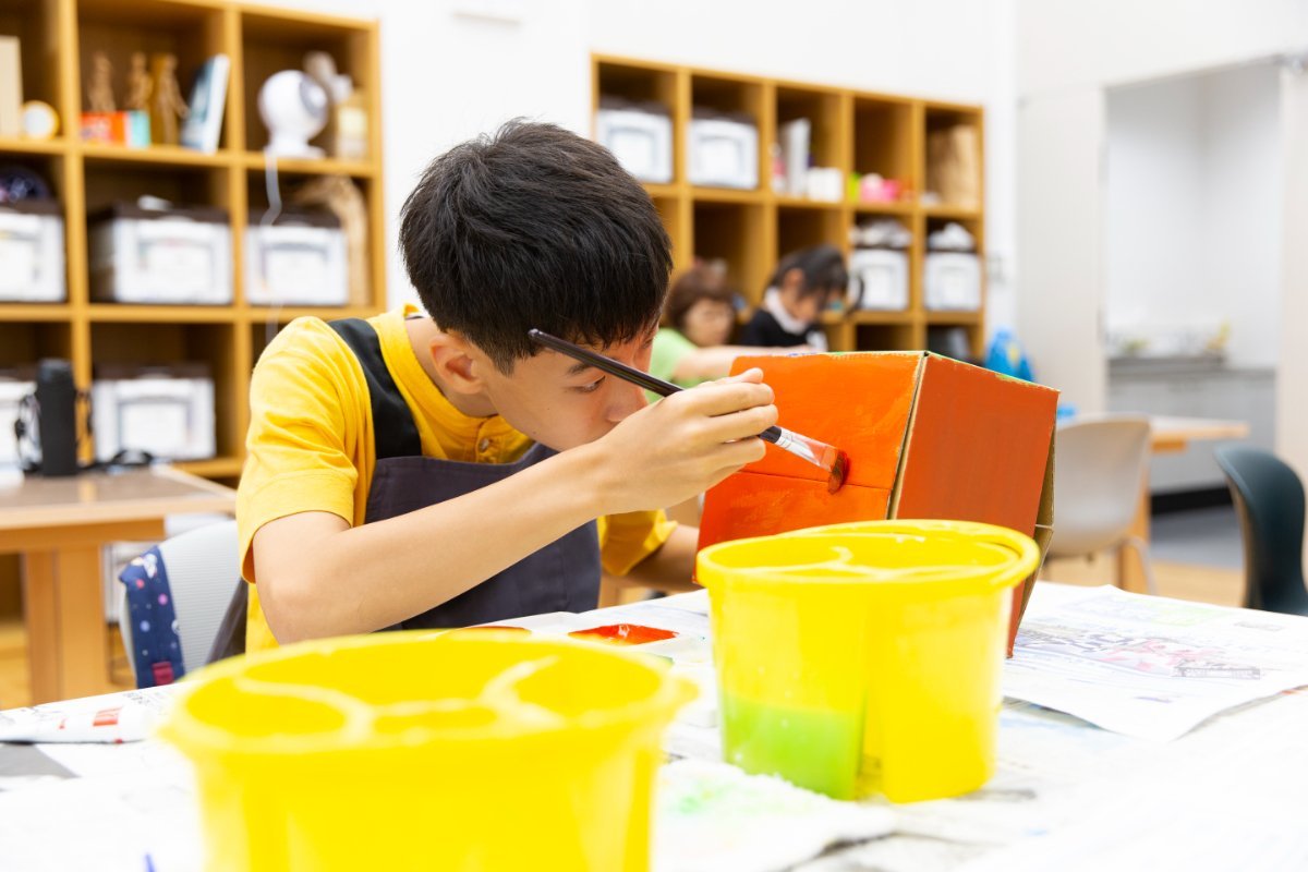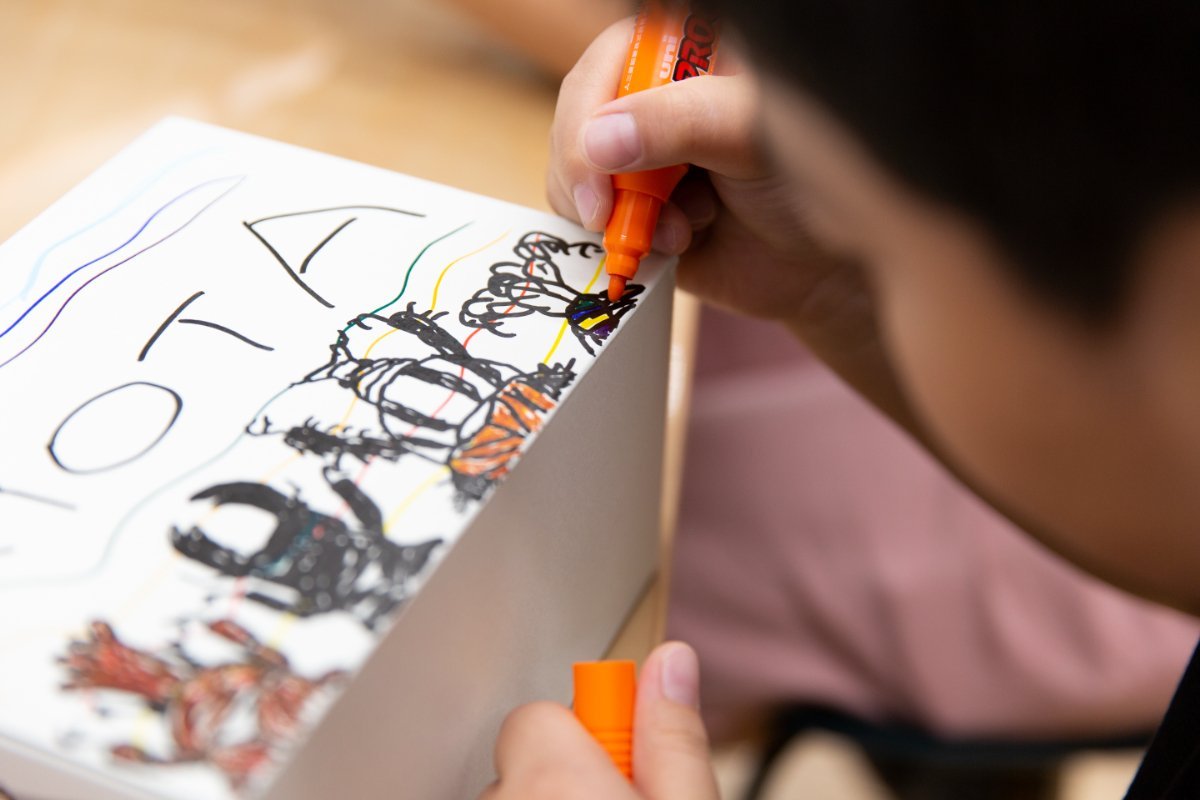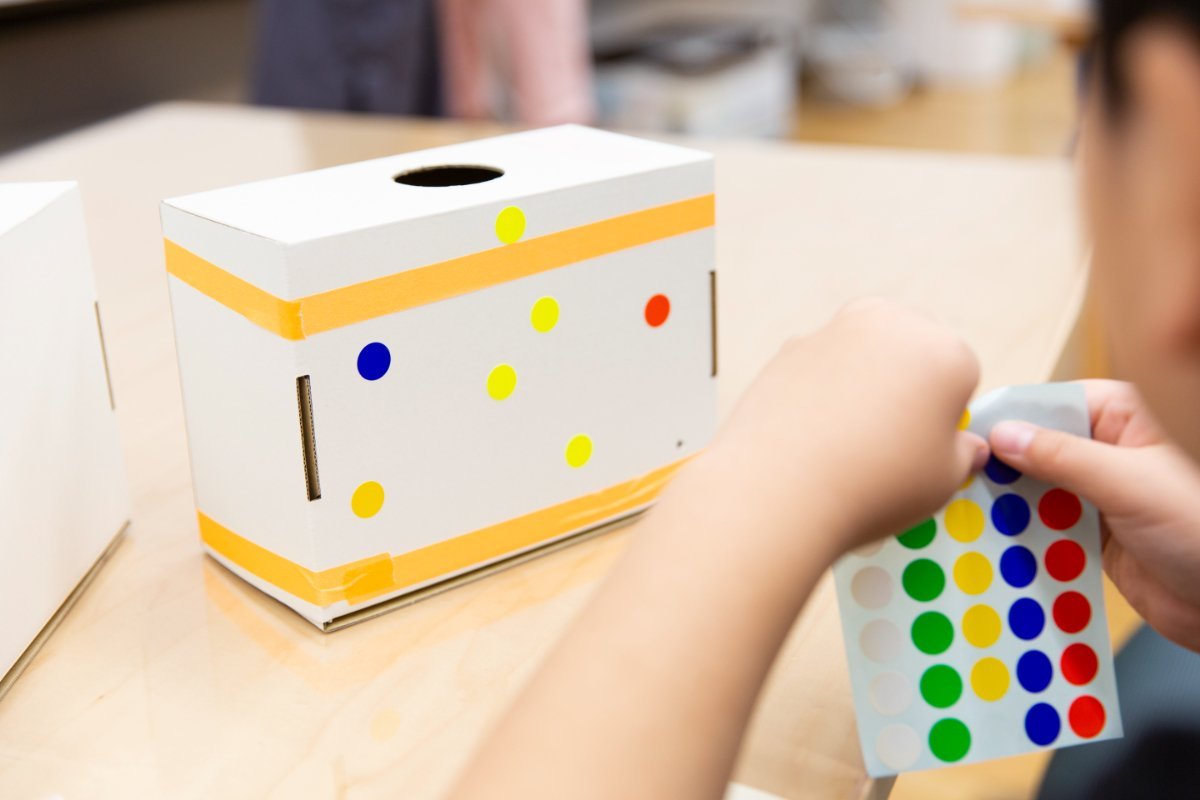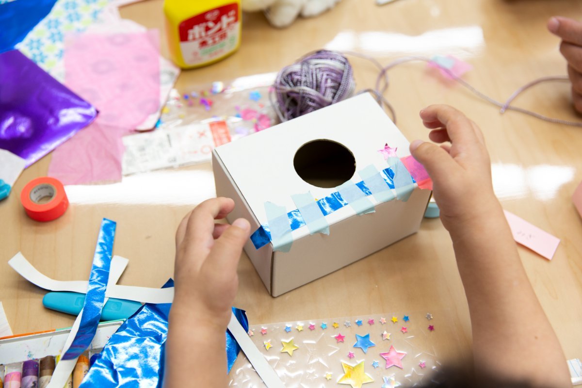 ペンを使って好きな絵を描きこんだり、色紙やシールを組み合わせて貼ったり、アクリル絵具をたっぷり使って描いたりして箱を彩っていきます。
