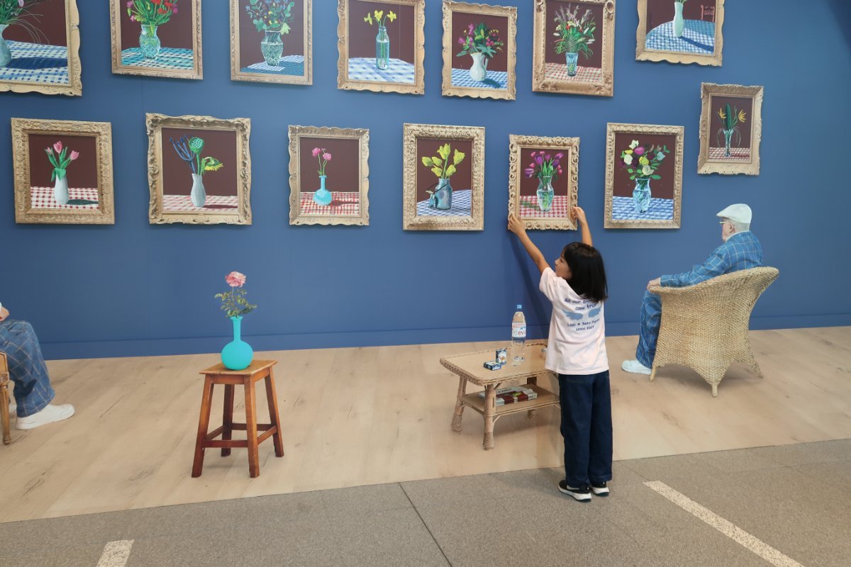 つづいて、エントランス・ホールにあるデイヴィッド・ホックニー《2022年6月25日、(額に入った)花を見る》からつくられたフォト・スポット(実際の作品は展示室内に展示)では、「作品の中に入り込むとしたらどんなポーズをとるか?」を意識した写真撮影を親子で行いました。