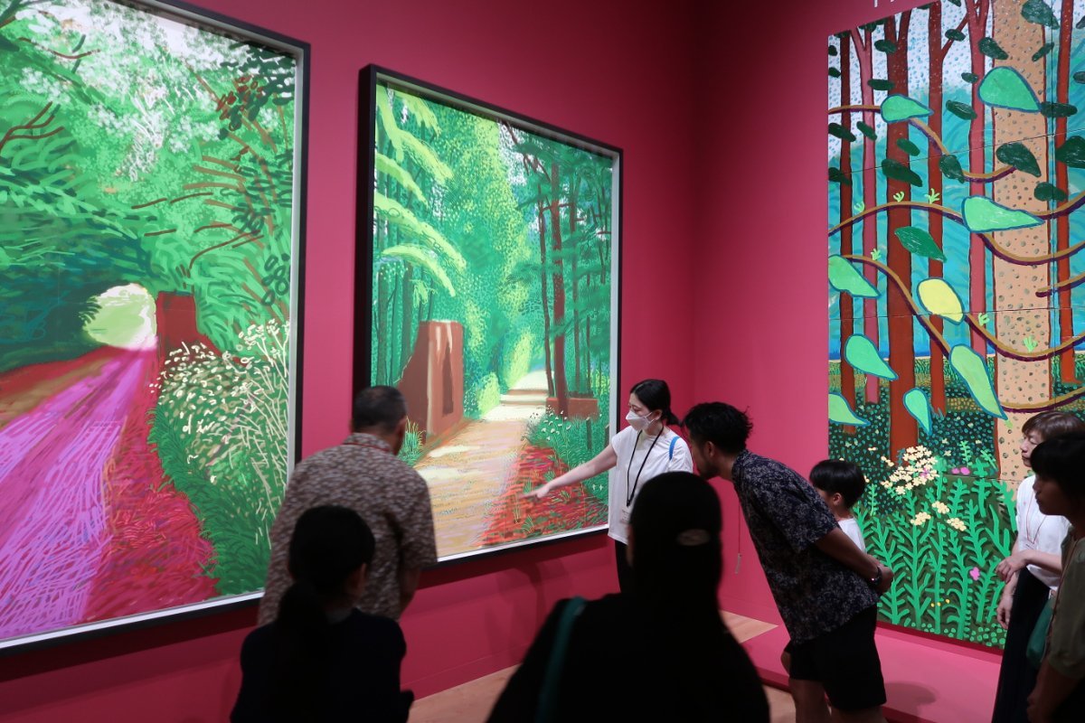 そして、「デイヴィッド・ホックニー展」展示室内の〈春の到来 イースト・ヨークシャー、ウォルドゲート 2011年〉シリーズを鑑賞し、先ほどの「作品の中に入り込めそう」というキーワードをもとに、13枚の絵の中から参加者に自分が入り込んでみたい絵をそれぞれ選んでもらいました。その理由を発表してもらうと、「水たまりに木が映っているから。」「この道を散歩してみたい。」「かわいい感じがするから。」「爽やかな風が吹いてきそう。」などの意見が。ほかにも、「全部こわそうだから入り込みたくない。」というハッとさせられる意見も。作品をよく観察して想像力を働かせているからこそ、また複数人で見るからこそ、参加者の視点が広がるさまざまな意見が出てきました。