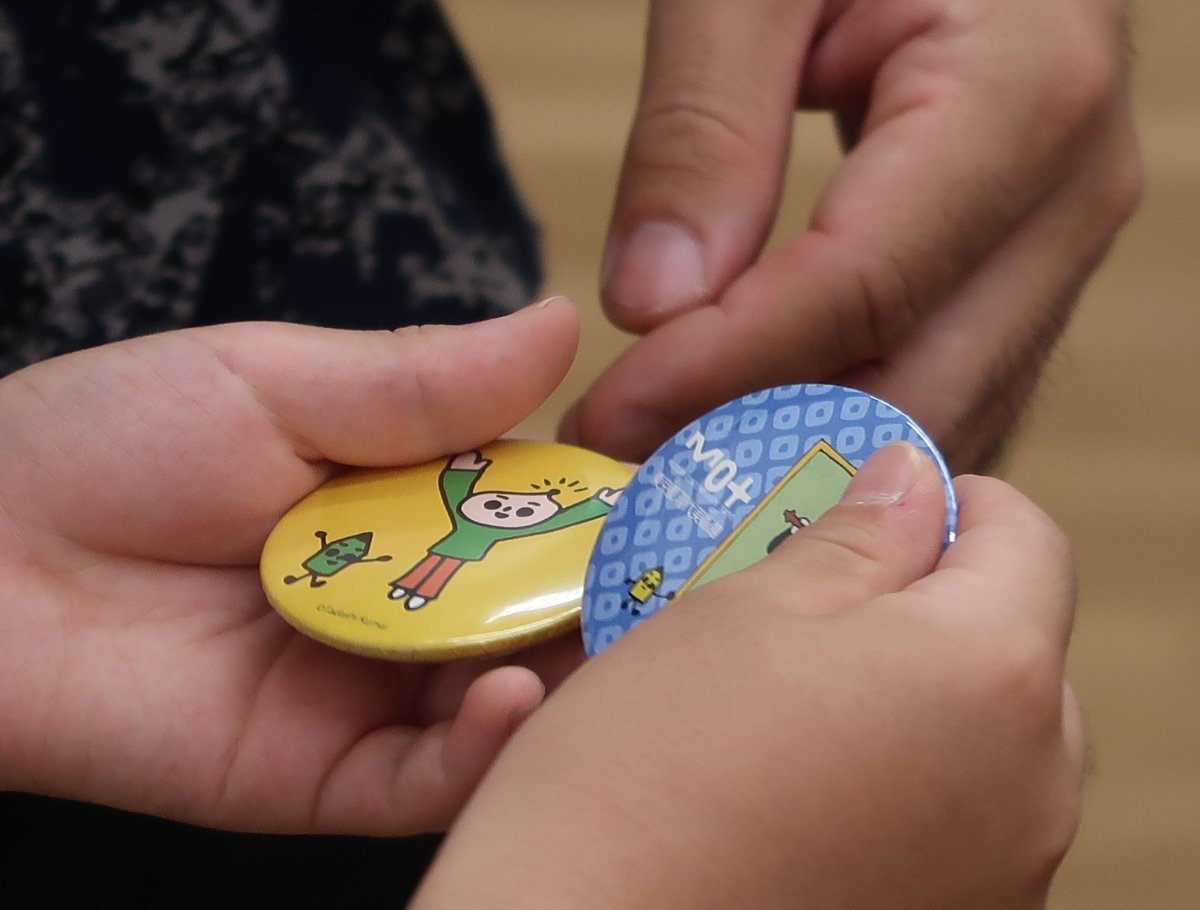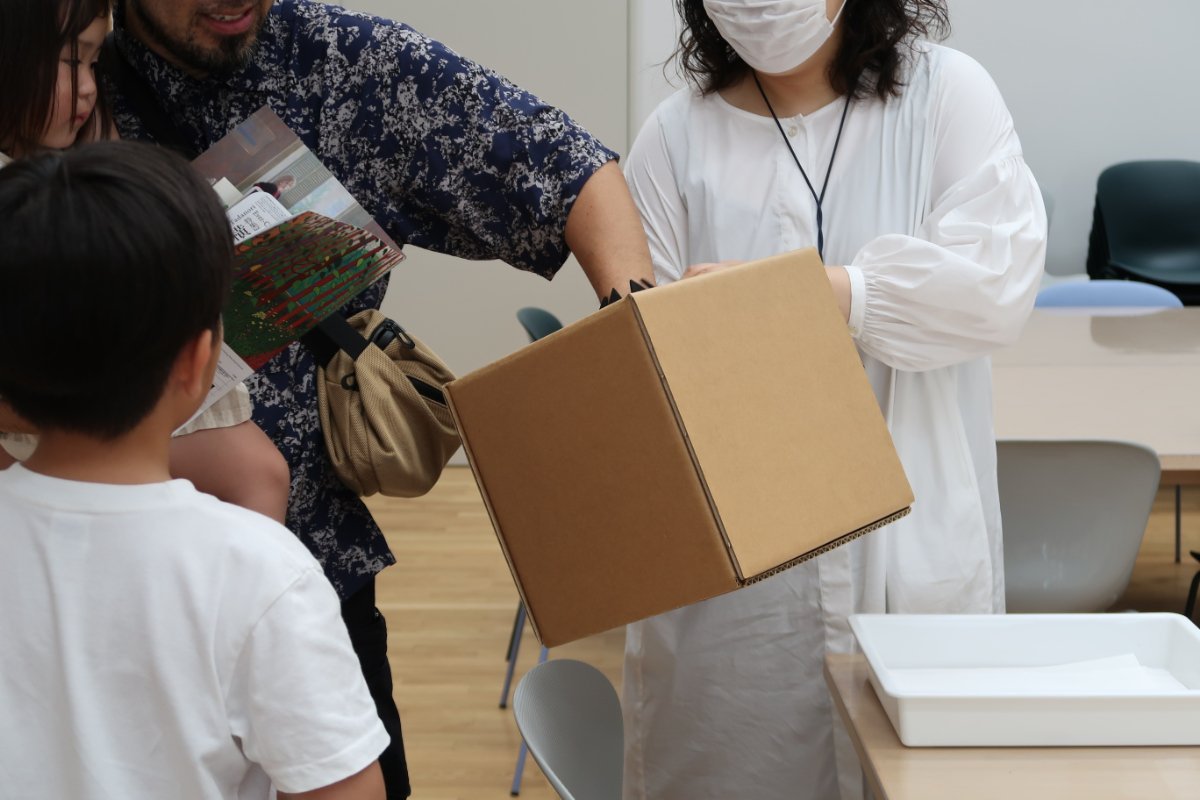 最後に、皆で体験してきたことを共有し、参加者には、お土産として中身の見えない箱の中から缶バッジを引いてもらいました。