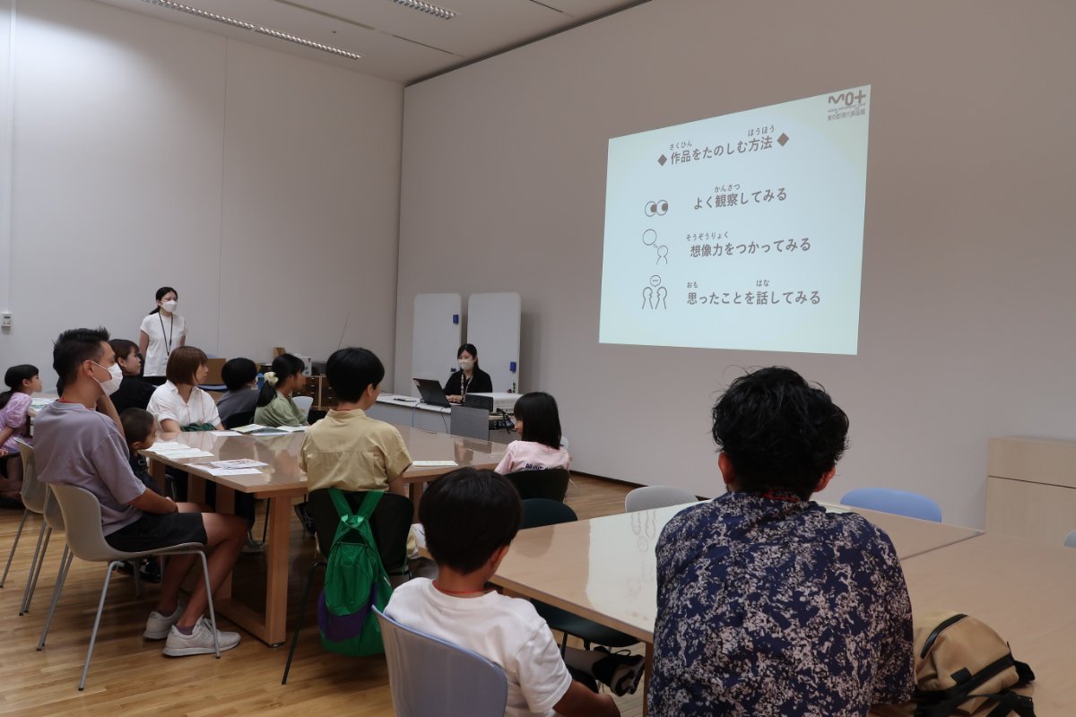 今回のプログラムでは、まず参加者全員でプログラムの流れと、美術館や作品を楽しむ方法についての話を聞き、その後2グループに分かれて、美術館学芸員と一緒に館内を巡りました。