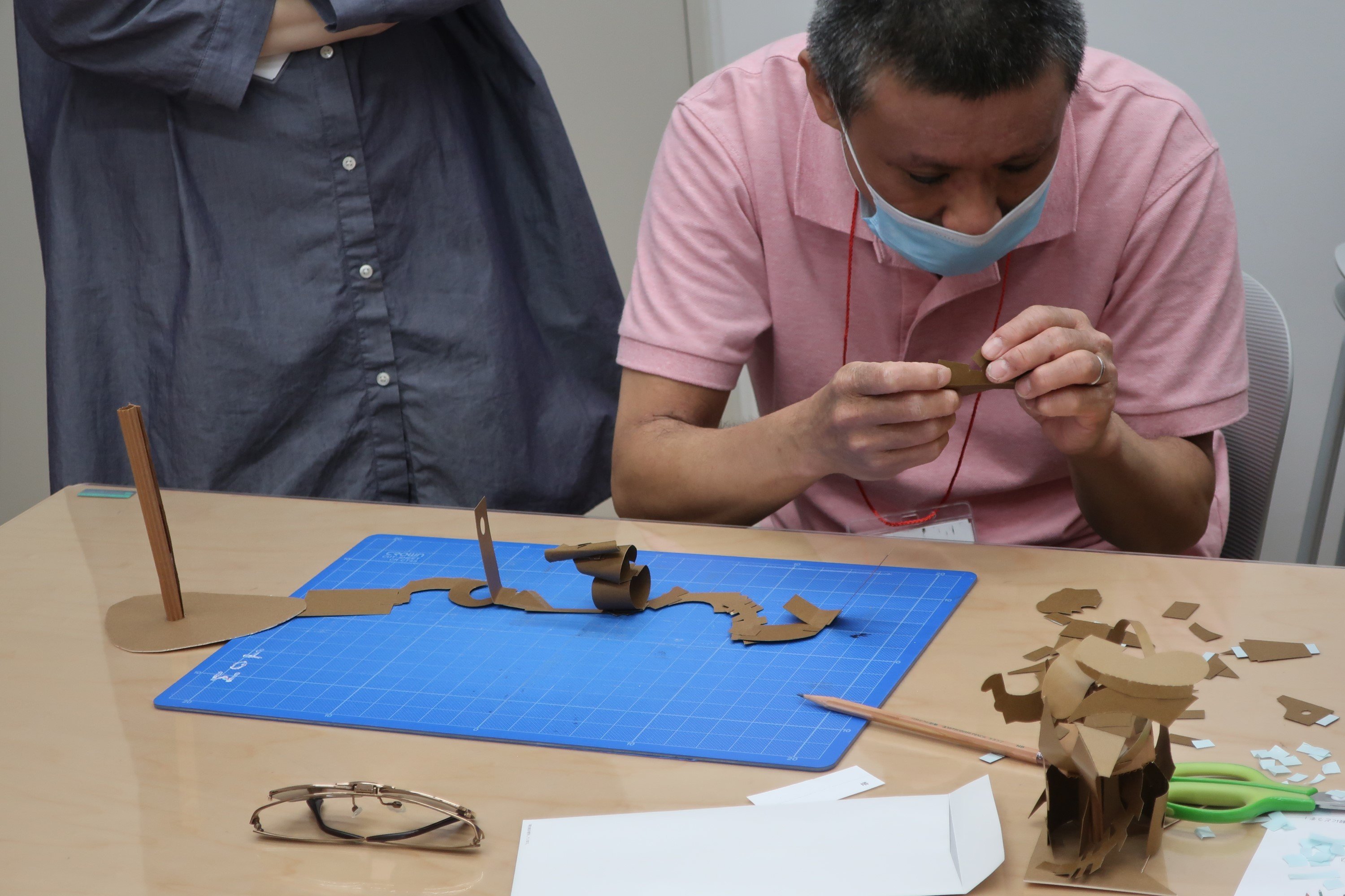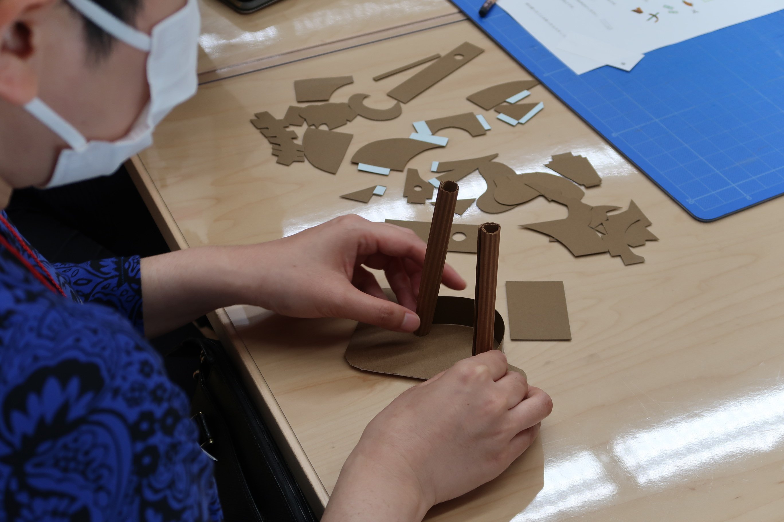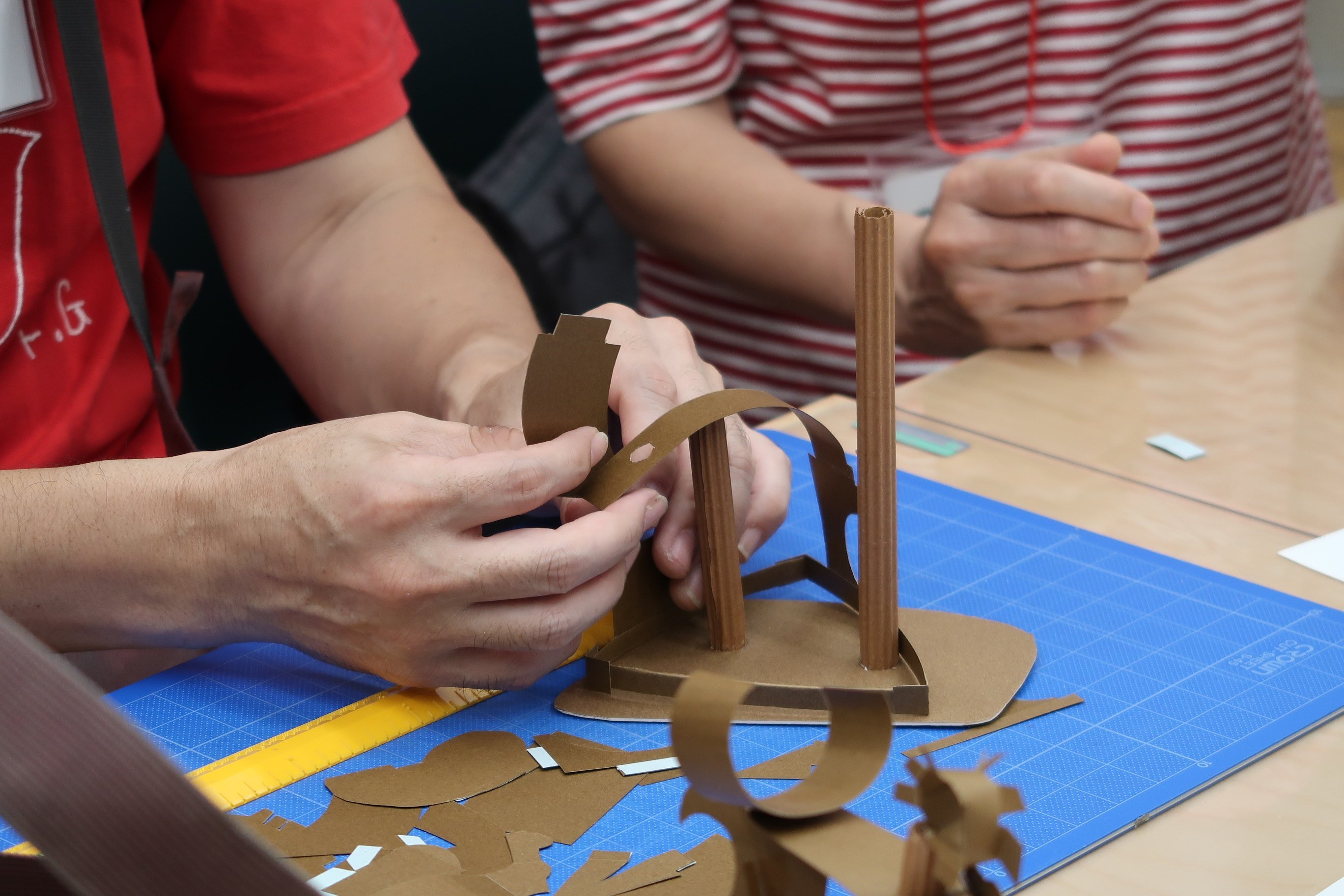 最初は少々戸惑う様子も見受けられましたが、エンジンがかかってくると次第に手を動かすスピードもアップ! パーツを折りたたんだり、細かな筋をつけたりして作っていく塔もあれば、木が枝葉を広げていくかのように形作られる塔も。また、パーツは支柱に付けていくもの、というイメージを打ち崩すように、横に這わせてつなげていく人もいました。それぞれに独創性に富んでいて、見ている私たちもわくわくします。