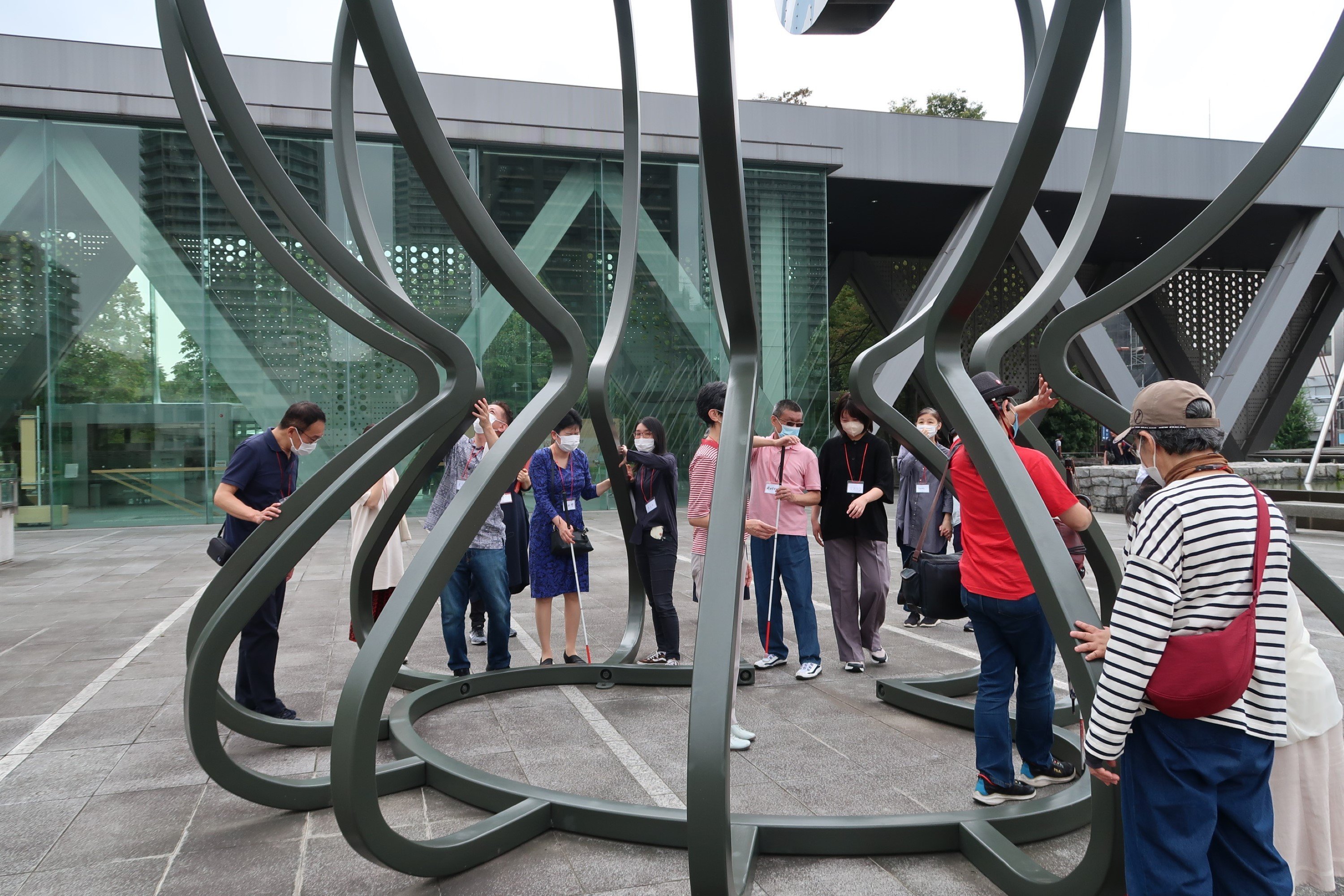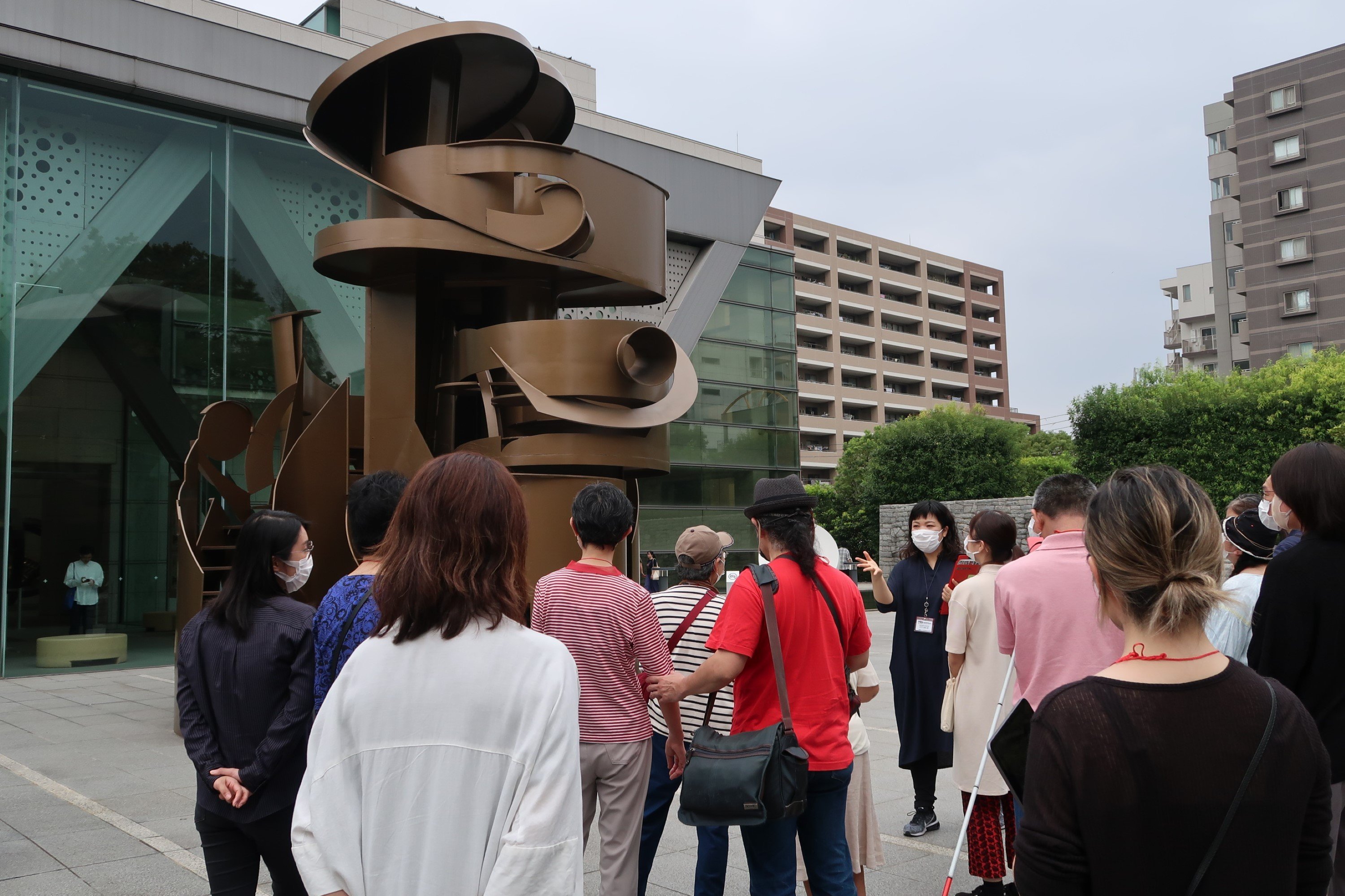 当日は、総勢16名が参加。最初にあいさつと自己紹介を行い、どんな人たちがこの場にいるかを確認したら、美術館広場にあるリチャード・ディーコン《カタツムリのようにB》から鑑賞スタート。