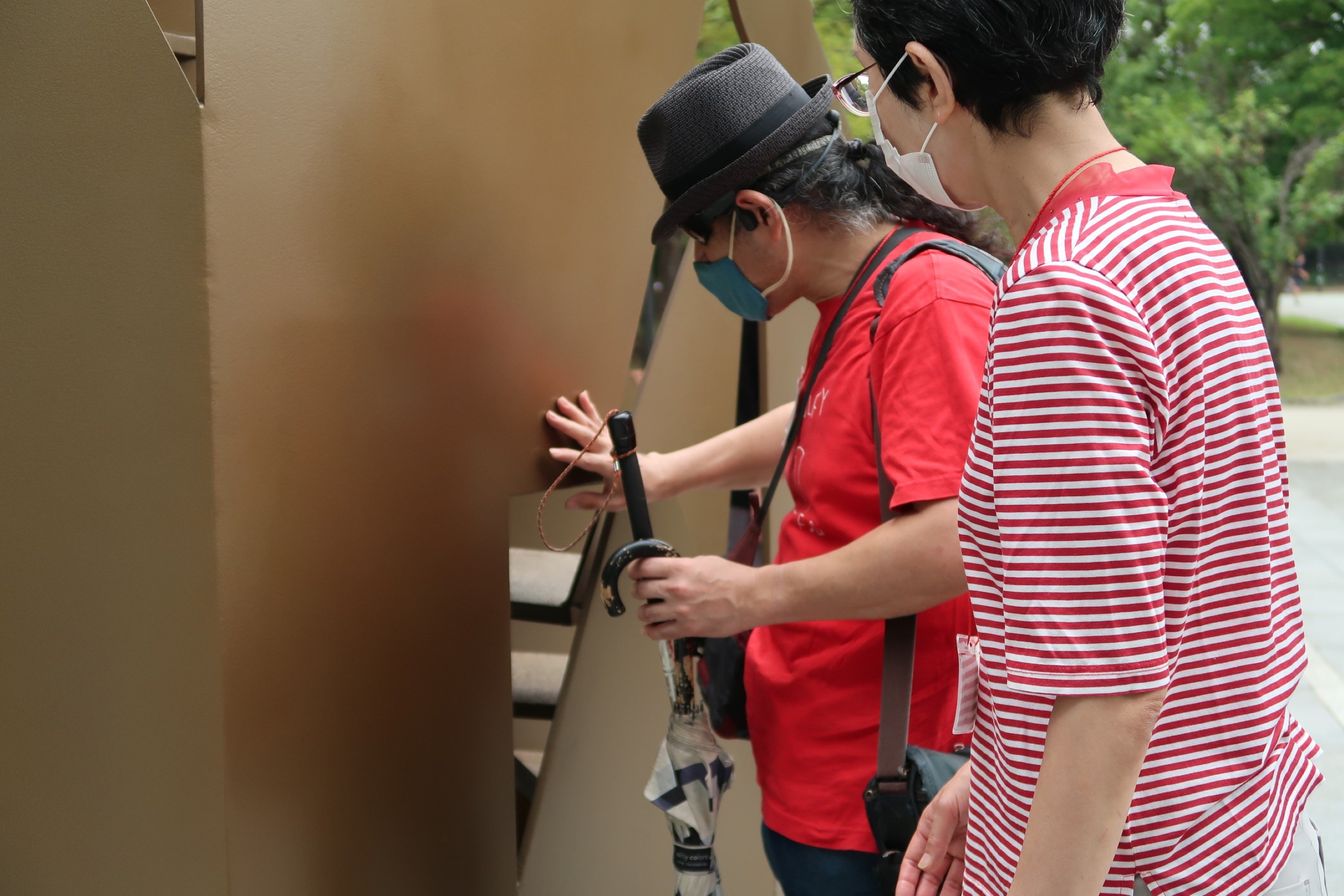 本作は、高さが約5mある大きな作品です。「手に持った白杖を伸ばしても上部まで届かず、さらに白杖もう1本分くらいの高さがあります」といった身近なものを取り入れた説明も。