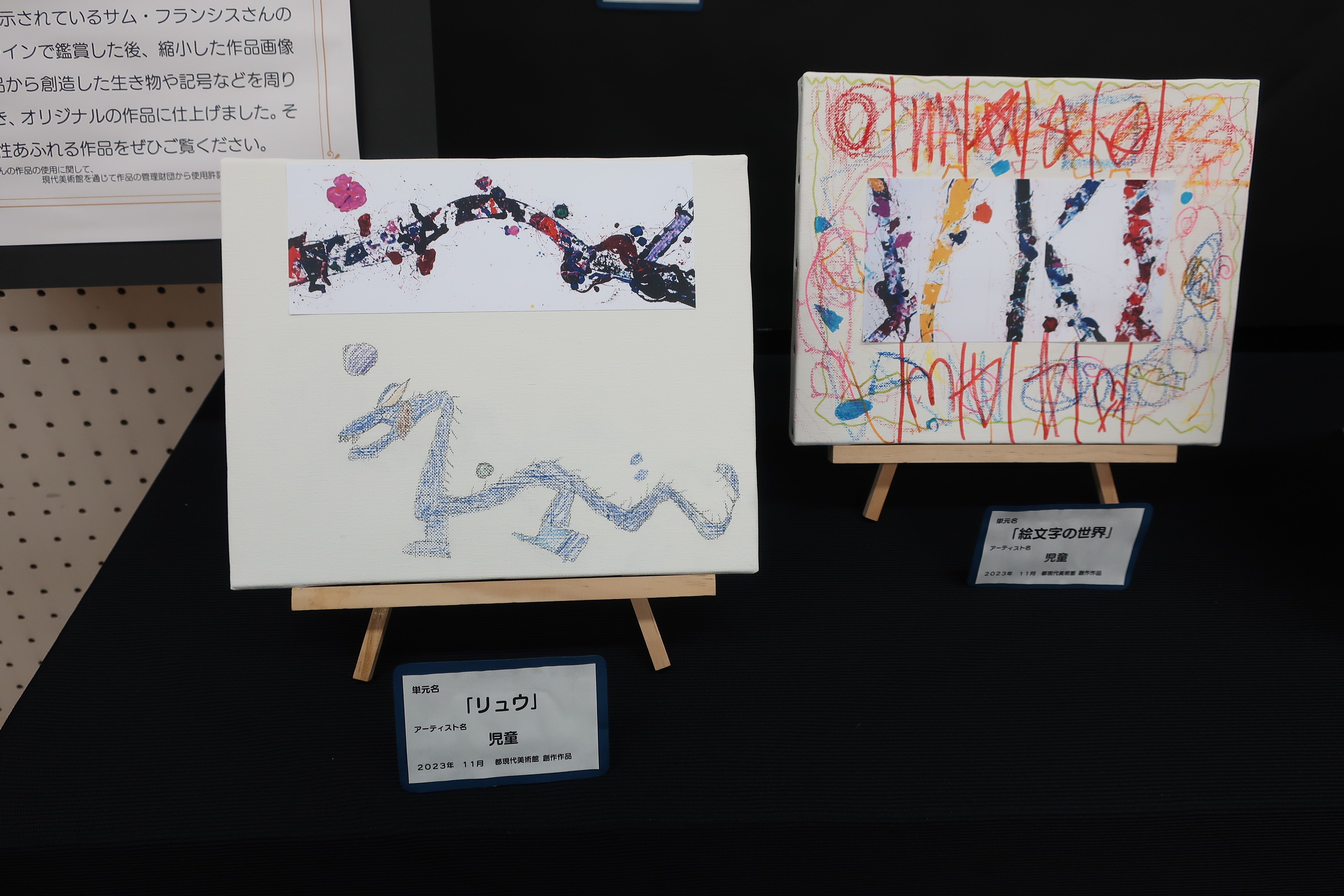 ここでポイントとなるのが、作品画像。展示されている4作品の中から1点を選び、カンヴァスの好きな位置に貼り付けたら、余白部分にサム・フランシスの作品から着想を得た色や形を表現していく、という内容です。作品から想像したことや注目したことなど、それぞれの鑑賞体験をもとに描いていきます。