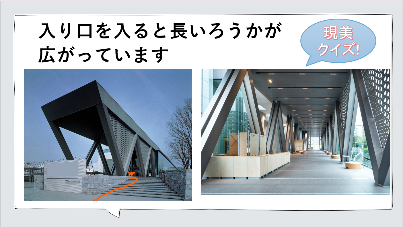 実際に美術館に入って進んでいく様子を味わえるような写真を用意し、クイズを交えながら話をしていきます。クイズの答えは2択。それぞれA/Bの回答カードを手元に用意してもらい、こどもたちとのやり取りを重ねていきます。