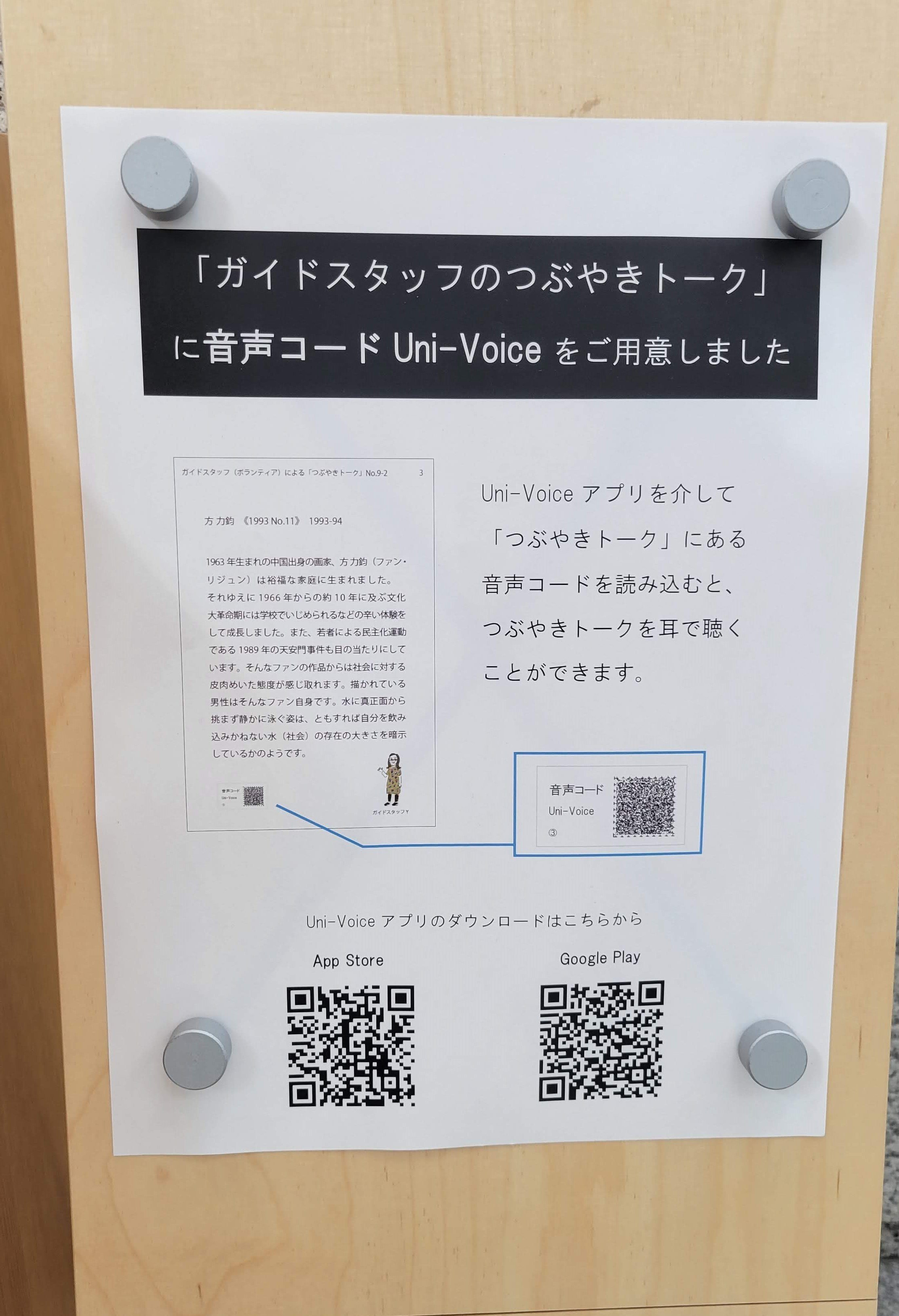 スマートフォンやタブレット端末にインストールしたUni-Voiceの専用アプリを介して二次元コード化された文字情報を読み込むと、各自の端末上に文字情報が表示され、音声での読み上げもできる、というものです。