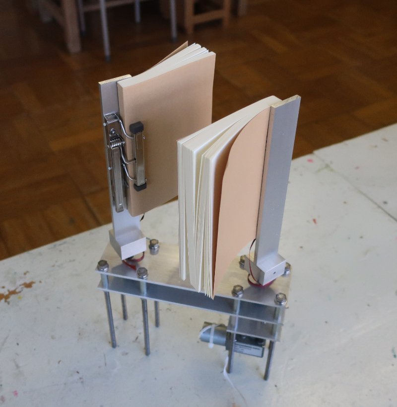 それは、2冊の本が同時にゆっくり回転し、ぶつかった瞬間に互いにページをめくり合う作品《めくりあう本》です。片岡さん、岩竹さんによると、本を反らせてパラパラめくる時の楽しい、気持ちいいという発見からこの作品を作ったそうです。2冊の本がめくり合う瞬間を見て、「パラパラ漫画が作れそう!」と答える子や、驚きのあまり拍手をする子もいました。