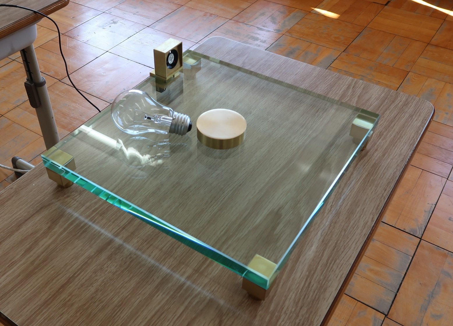 一つ目は、電球を使った作品《回る電球》。電球に少しの力を加えるとその場でくるくると回り始めます。回り続ける電球を不思議そうに目で追う生徒たちに片岡さんがその仕組みを明かします。机に何気なく置いた電球がくるりと回り出した時、いつも見ていた電球が“違うもの”に見えたことからこの作品の着想を得たそうです。「星の軌道みたい。小惑星とか隕石の衝突みたい」「重心がすごい…。地球を感じる」「下に落ちそうで落ちない」と次第に生徒たちから感想が出てきます。