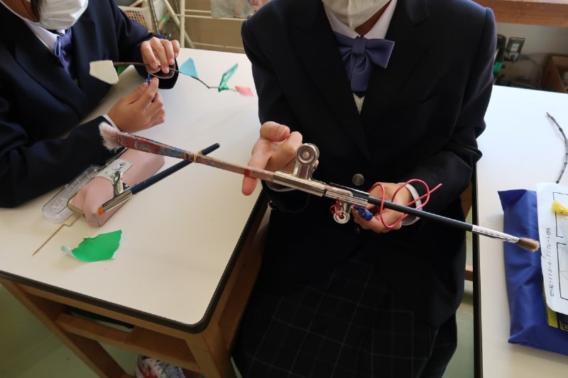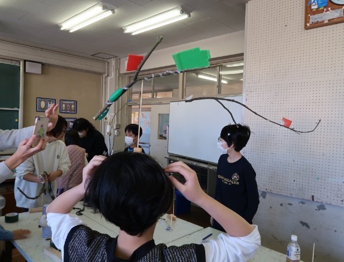着々と出来上がり、片岡さんが用意してくれたカチューシャに完成した《やじろぐ枝》をつけてもらう生徒も。頭の上でバランスを取って揺らしながら、まわりの友達にうれしそうに見せています。