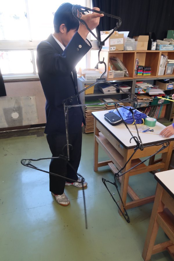 片岡さんからの制作方法の説明後、生徒たちは思い思いに材料を選びます。材料は割り箸や角材、筆、ストロー、針金、クリップ、ハンガーなど。他には、片岡さんが新潟の滞在制作の際に海で拾ってきた漂流物もあります。生徒たちはまず材料を決め、指でヤジロベエの支点の位置を探ります。支点をうまく見つけられずバランスを崩し、「ああ!ダメだ~!」という声とともに、あちらこちらで材料が床に落ちる音も聞こえてきました。材料を複数組み合わせて、ヤジロベエの重心を支点より下にしてバランスをとる工夫をしていきます。