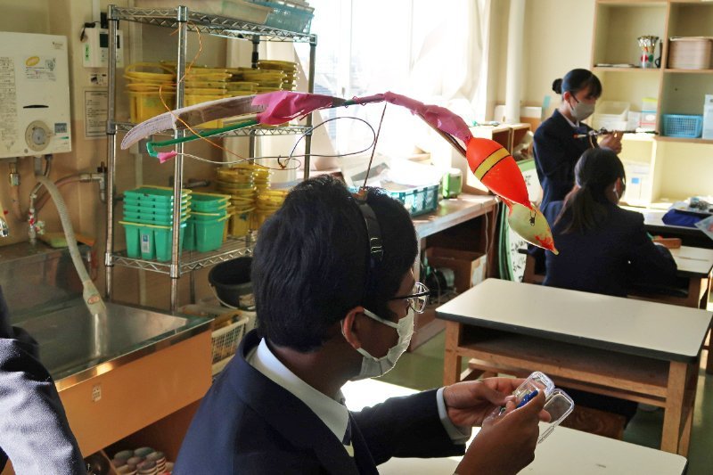 完成した《やじろぐ枝》を頭に乗せる生徒