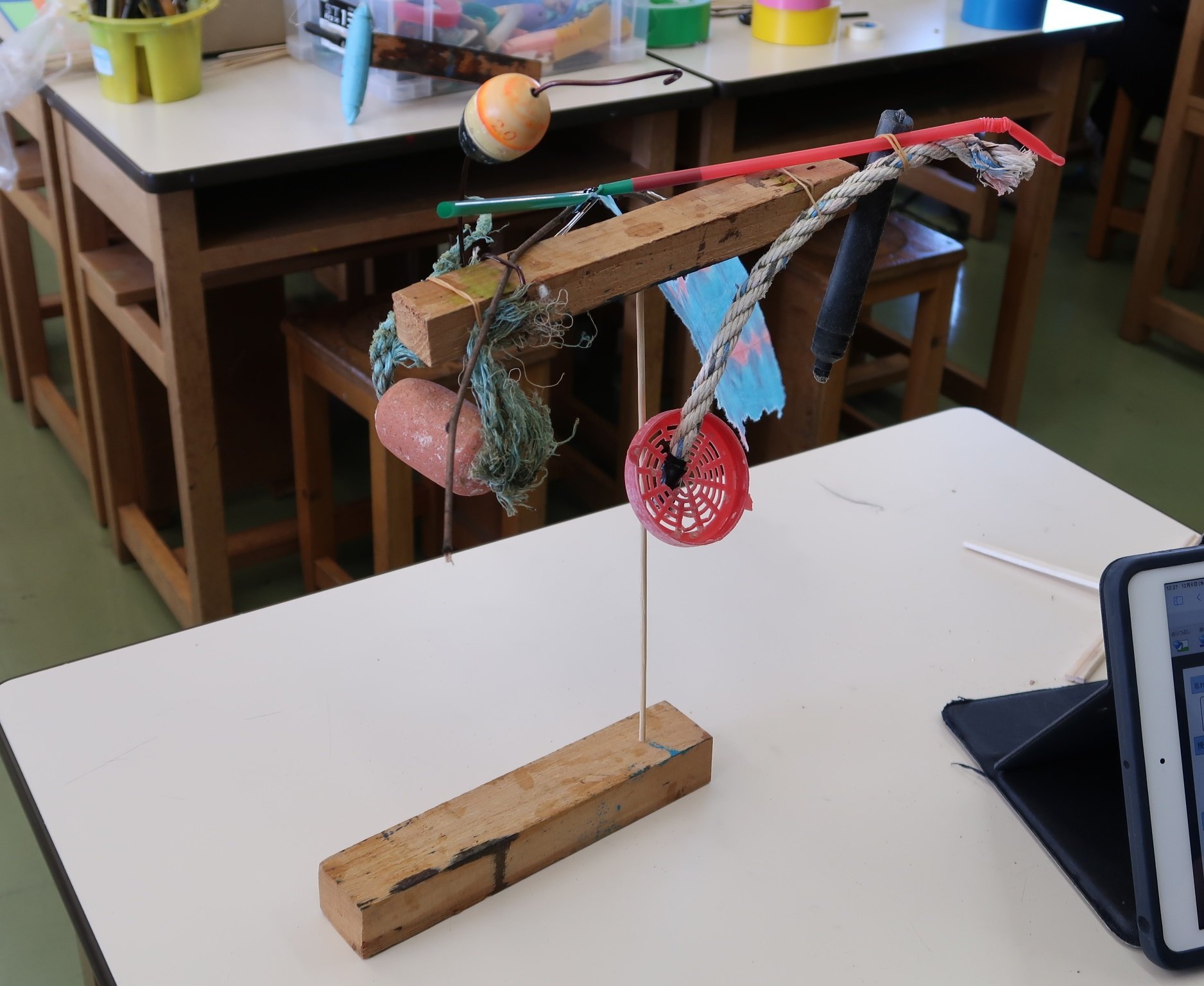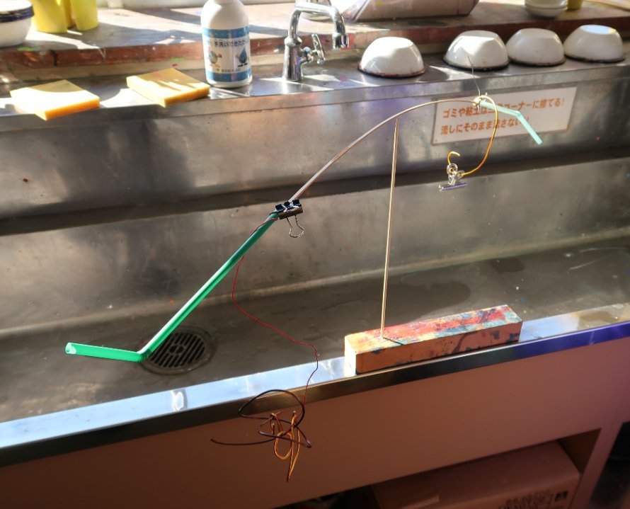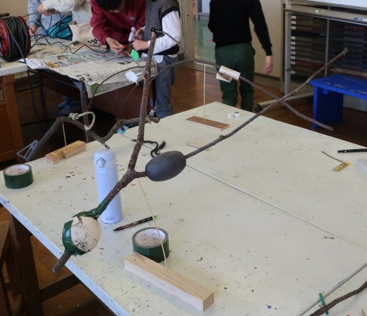 片岡さん、岩竹さんは2013 年パリでのレジデンスをきっかけにアートユニットとして活動を開始し、身のまわりの物や現象、「動き」を取り入れた作品を制作しています。今回の訪問授業のテーマは「ものごとが動く、物とまわりの力の観察」。授業の前半には学校へ運んだ二人の作品4点を鑑賞し、物のもつ本来の用途や機能とは離れて見えてくる物の動きの面白さや仕組みに注目しました。後半にはその中の作品《やじろぐ枝》を題材として、こどもたち自身でヤジロベエの原理を用いた作品を作りました。