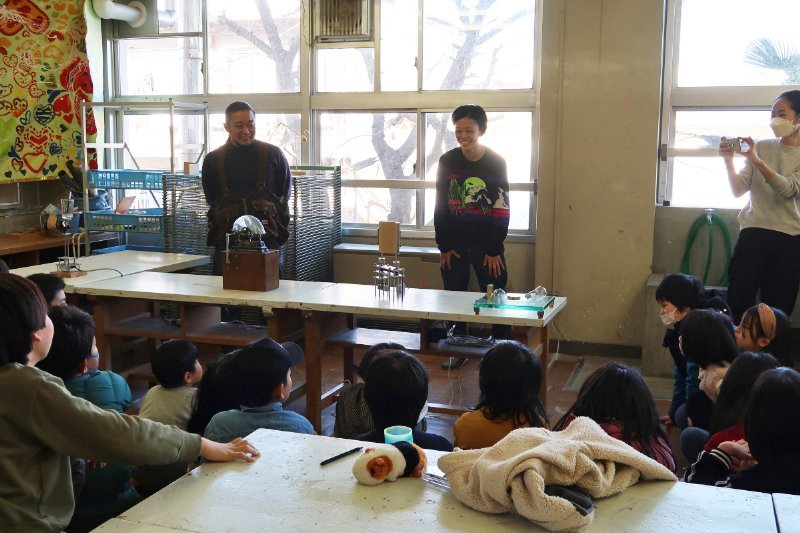 二人は作品の原理や仕組みをわかりやすい言葉でこどもたちへ伝え、「普段の生活で見過ごしていることや不思議に思ったことを作品にしている」と話します。二人の自然体で温かい雰囲気がこどもたちの緊張を少しずつほぐしていきます。