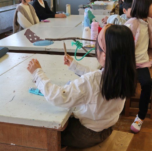 《やじろぐ枝》の制作では、枝の支点を探る作業は真剣そのもの。黙々と集中する子、どんどん手を動かしていく子、じっくり丁寧に作業する子、それぞれのペースで自分の《やじろぐ枝》を作っていきます。片岡さん、岩竹さんはこどもたちの相談にのりながら、そっと彼らの作業を見守ります。