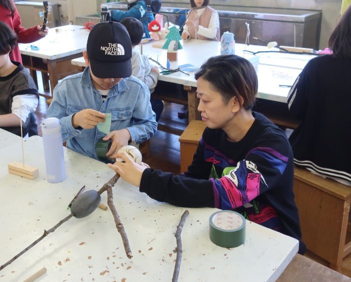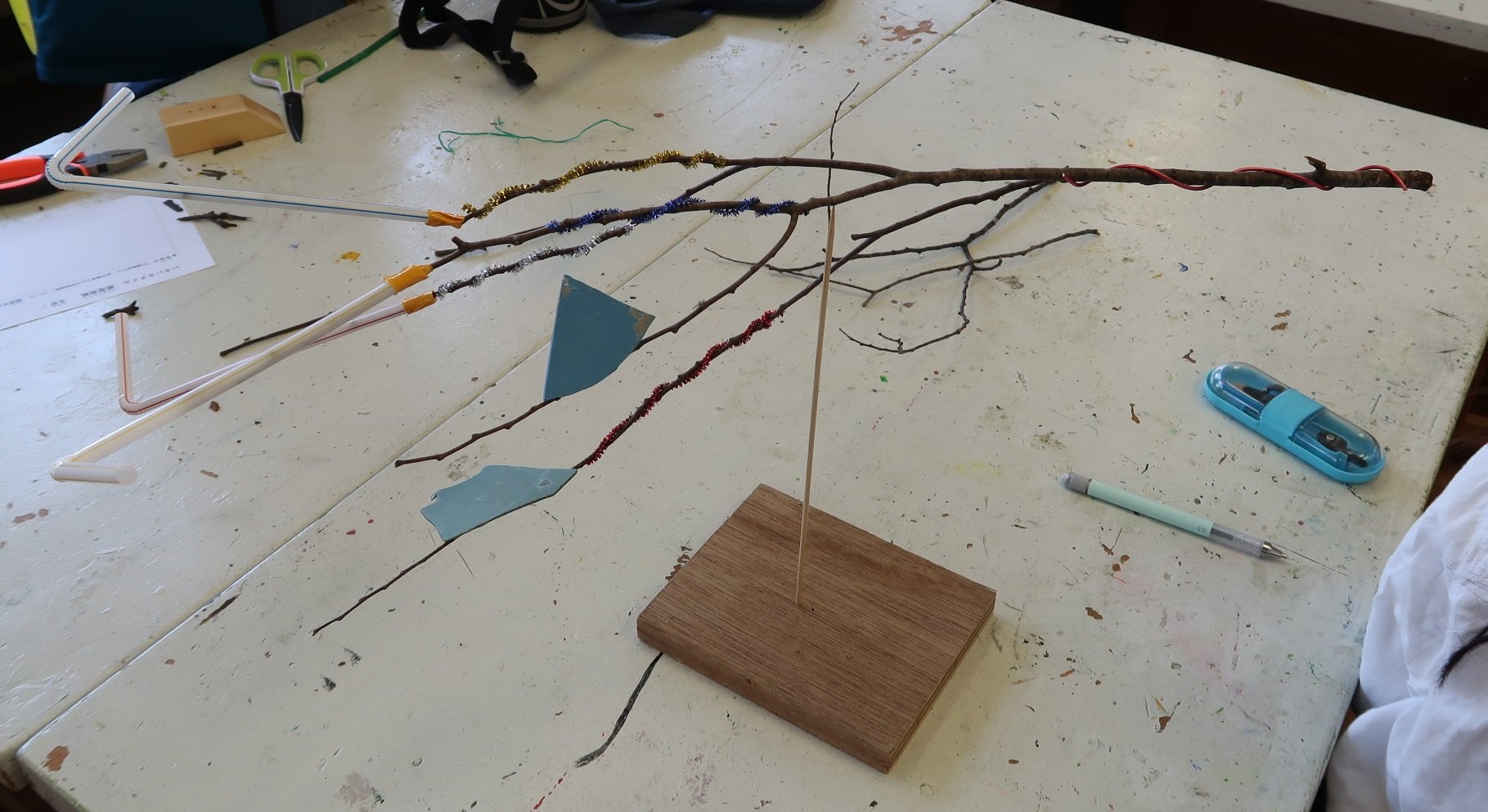完成後には、こどもたちから自分の作品の自慢したいところやこだわったところを教えてもらい、皆で鑑賞し合いました。重い材料をつけるため支点の位置を工夫したもの、枝がよく動く効果をねらったもの、枝の形から動きを感じるものなど、片岡さん、岩竹さんは一人ひとりへ感想を伝えました。