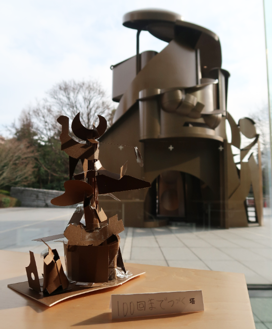 当館屋外にあるアンソニー・カロの《発見の塔》をテーマに、「セルフクルーズ ―作ってみよう『〇〇の塔』」をオープンワークショップ形式で実施しました。美術館スタッフによる案内のもと、参加者自身で《発見の塔》をよく観察したり登ったりしてから、塔が臨めるエントランスで、紙のパーツを使ってオリジナルの塔づくりをしました。参加者は、塔の内部がどうなっているのか、塔からはどんな景色が見えるのか、塔を観察し実際に登ったことで、気づいたことがたくさんあったようです。