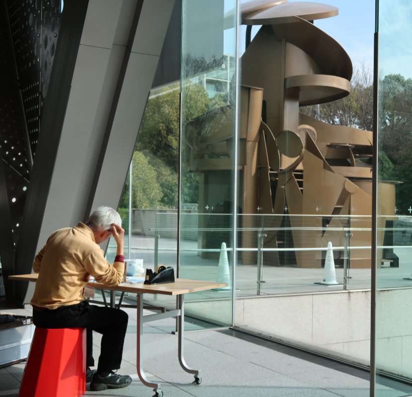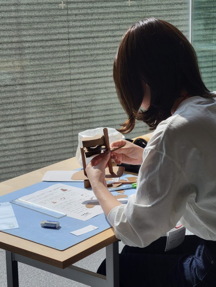 塔づくりでは、自分の席から窓越しに《発見の塔》をよく観察しながら作業する人、家族と一緒に相談しながら一つの塔を合作する人、手元のパーツを丁寧に見比べながらアイディアを練っている人など、それぞれの進め方で真剣に取り組んでいました。