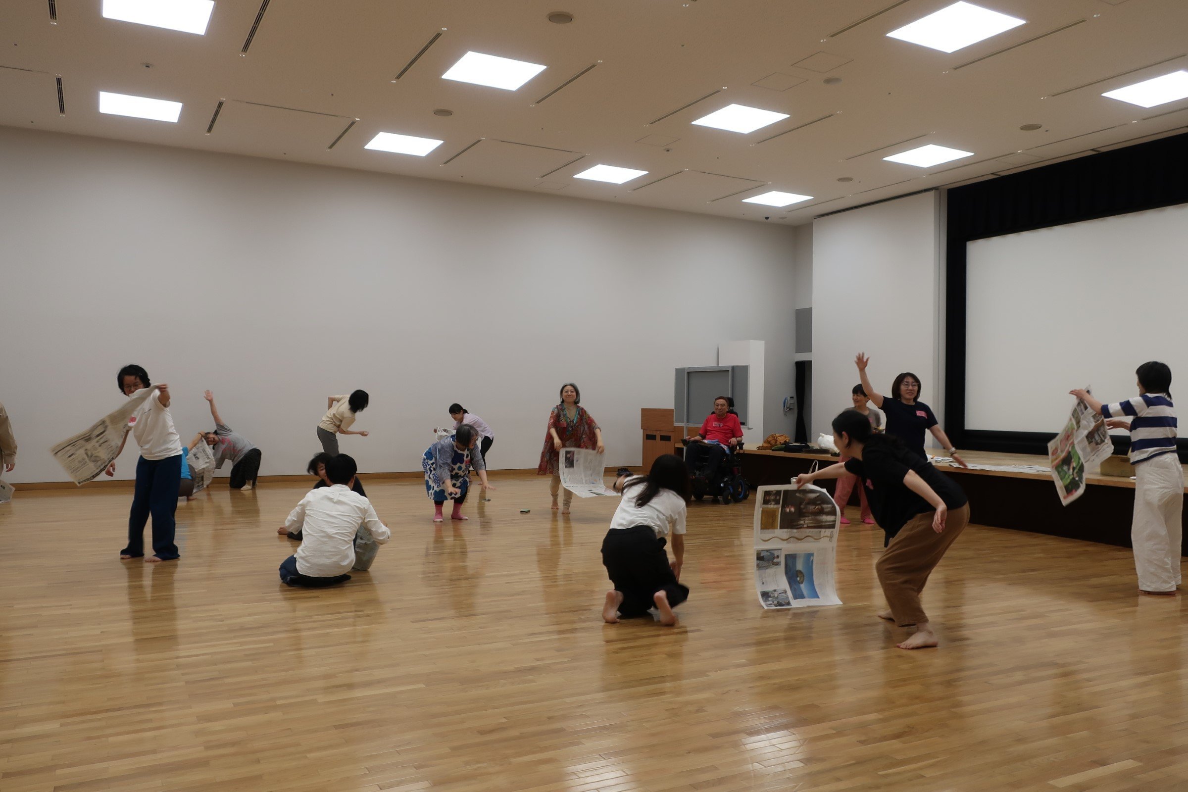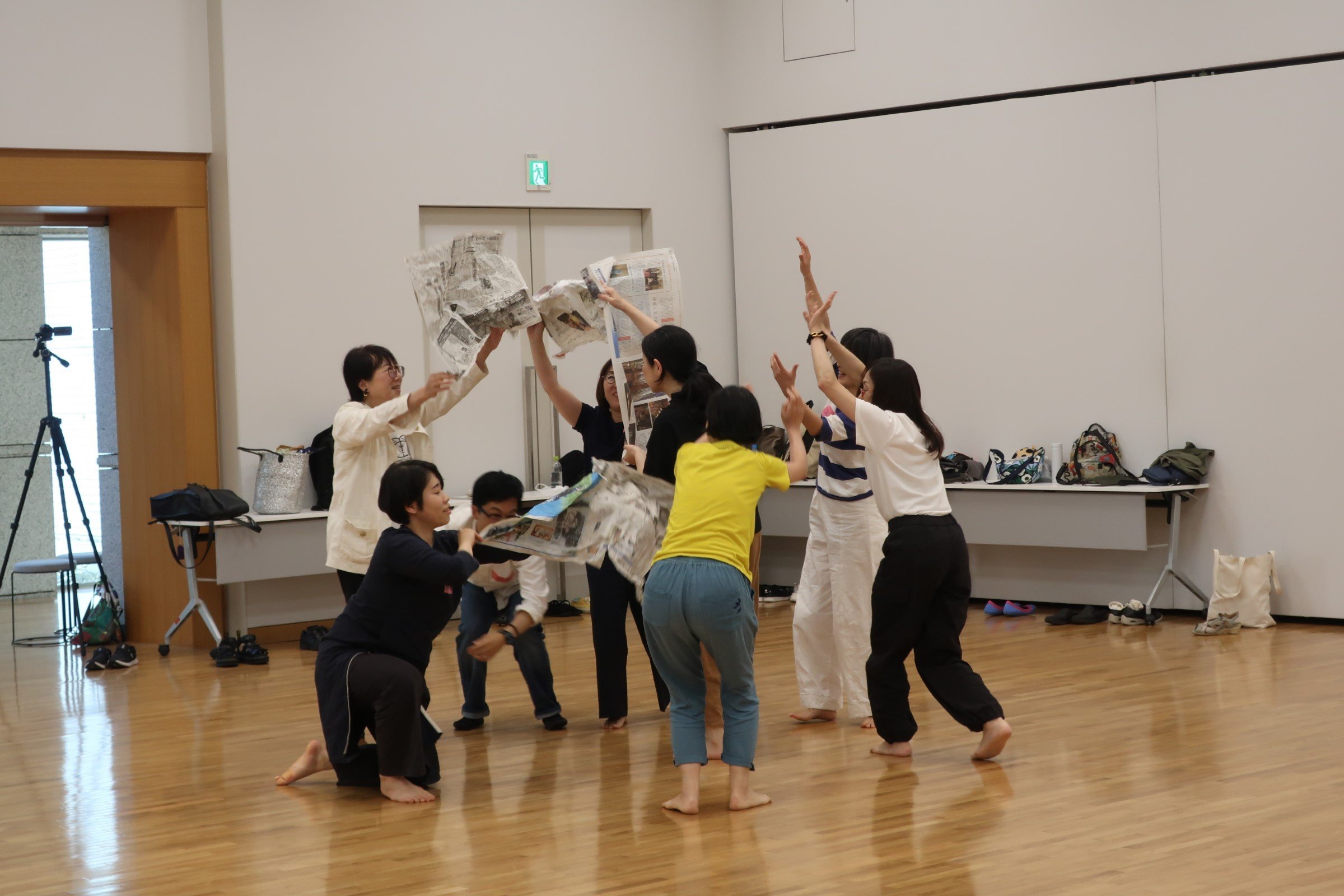 二人一組で始まった新聞紙のワークは、4人一組、8人一組と、次第に参加人数を増やしていきます。新聞紙を持つ人同士、動く人同士の間にも、新たなコミュニケーションが生まれ、複雑な動きが生まれていきました。ところどころで新井さんからの声がけも。