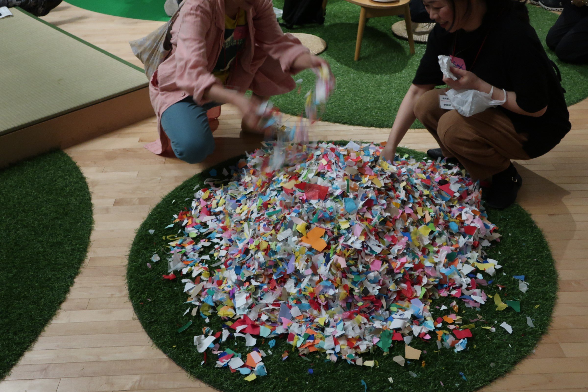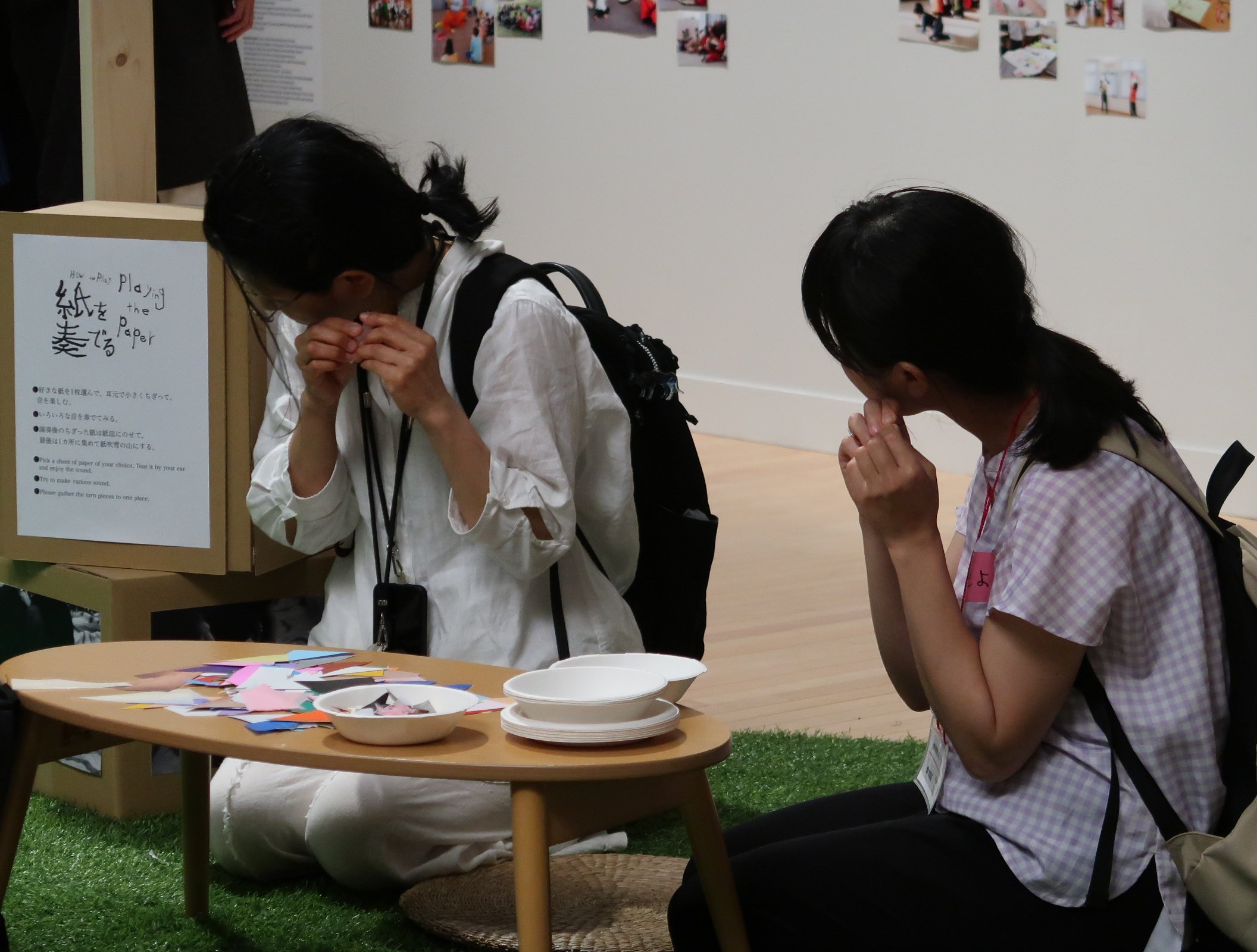 折り紙やお花紙、トレーシングペーパーといった厚みも質感も異なる紙を、ゆっくり、勢いよく、力を込めてなど特徴づけてちぎってみると、耳に届く音は大きく変化します。新井さんはこれを「演奏」と表現しています。演奏者は自分。聞き手も自分。耳の感覚が研ぎ澄まされるような体験に、参加者からは驚きの声が上がっていました。