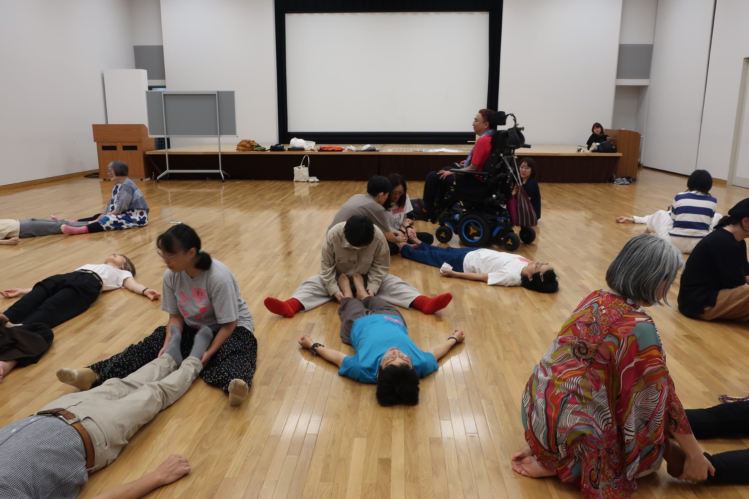 二人一組になったら一人が横たわり、もう一人は相手の足をゆらゆらと揺らします。揺らすときのポイントは、揺らす側の人が「プルプル」と声に出しながらやること。「プルプル」を「ブルン」に変えると、不思議と揺らし方も変わります。参加者からは、「結構言葉と共鳴する!」との声も。