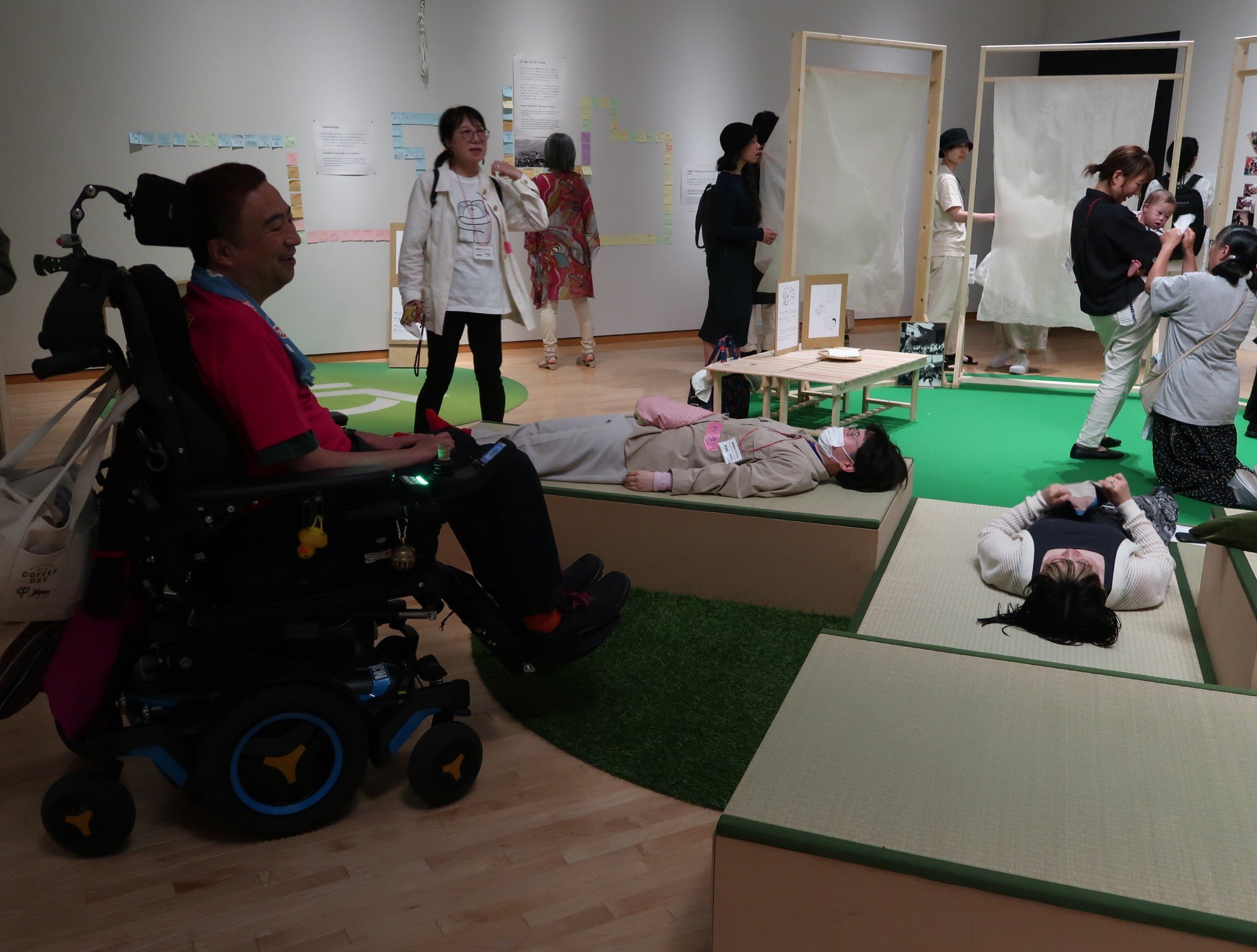 先の展示室には、水袋をお腹の上に載せ、身体と水袋とが連動するような体験型の作品がありましたが、今度は自分の身体が“水袋”になったかのようです。一見するとマッサージ大会のようにも見えますが、身体を柔らかく使うための導入のようなワークです。