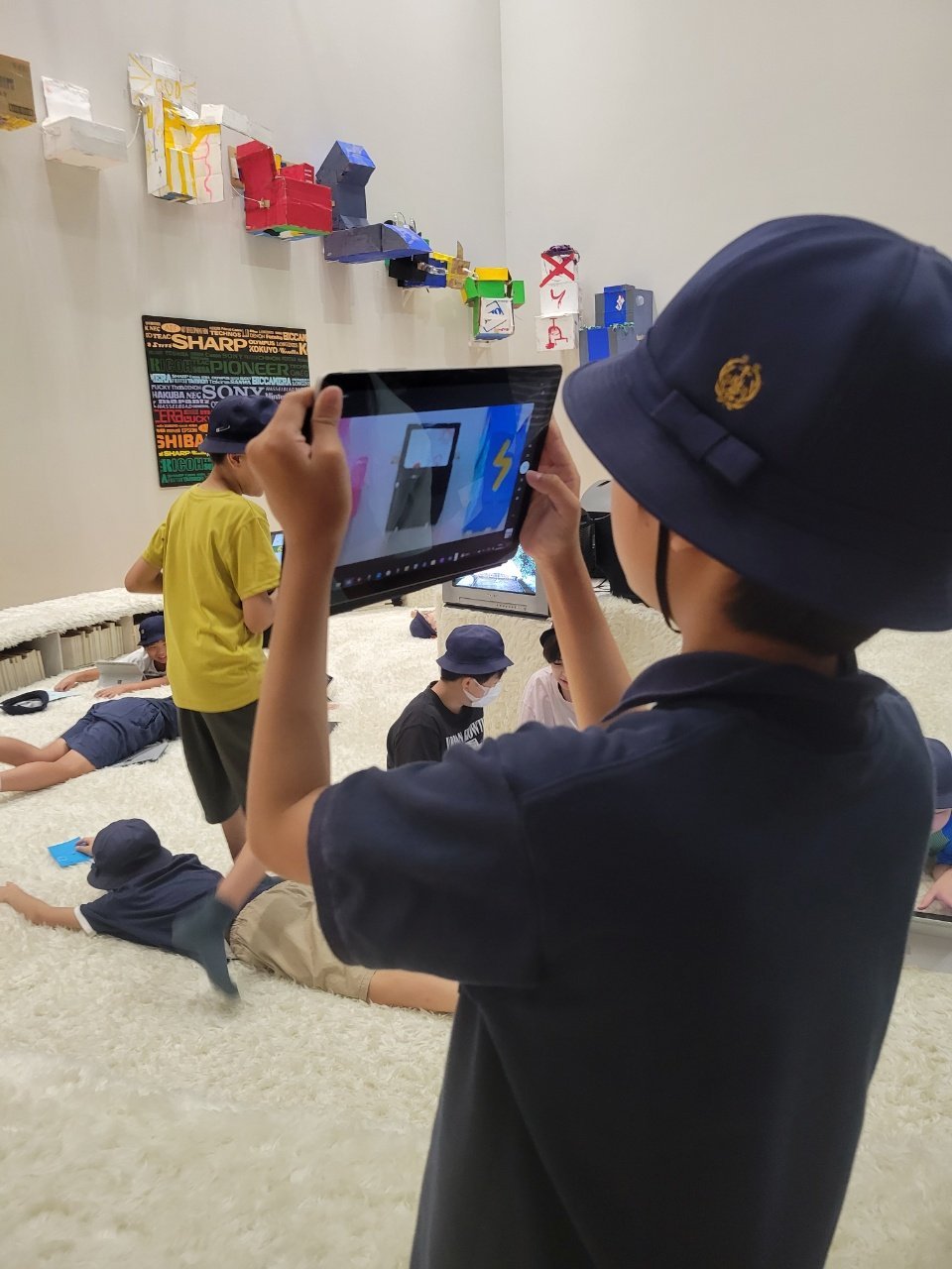 子どもたちはそれぞれ気になる作品や展示の様子をタブレットでとらえていました。