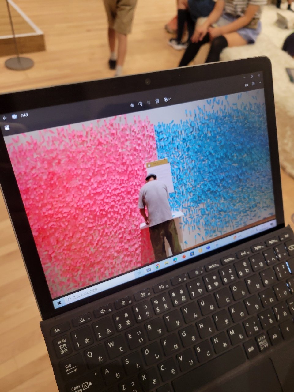 「自分の作品が美術館に展示される機会はなかなかありません。記録に残したい人はタブレットで撮影しましょう」と先生は子どもたちに伝えます。