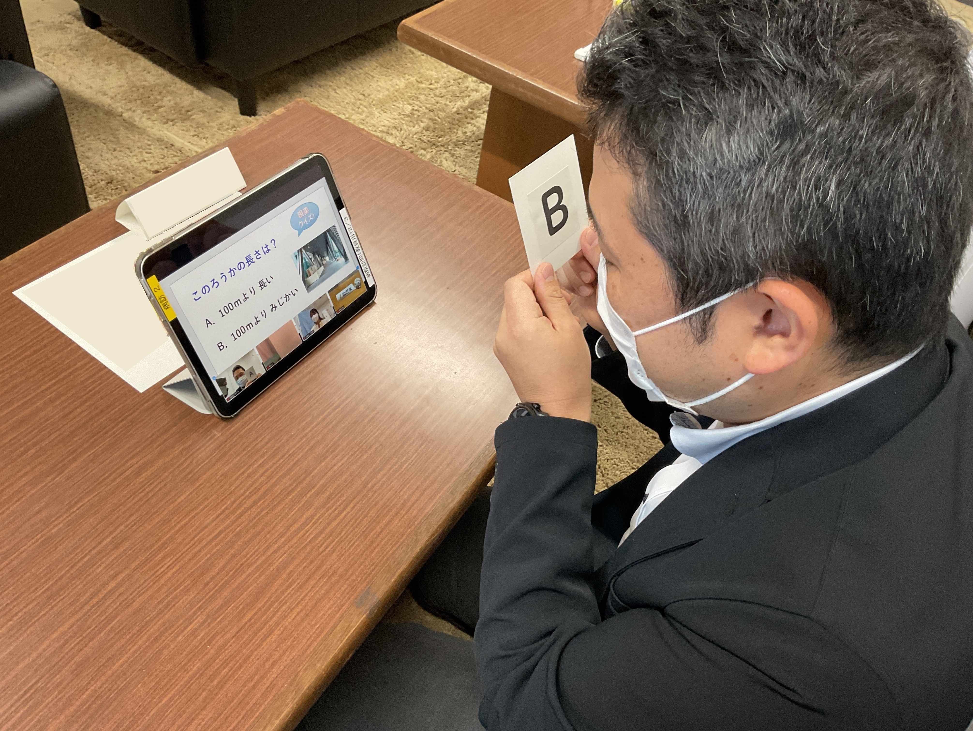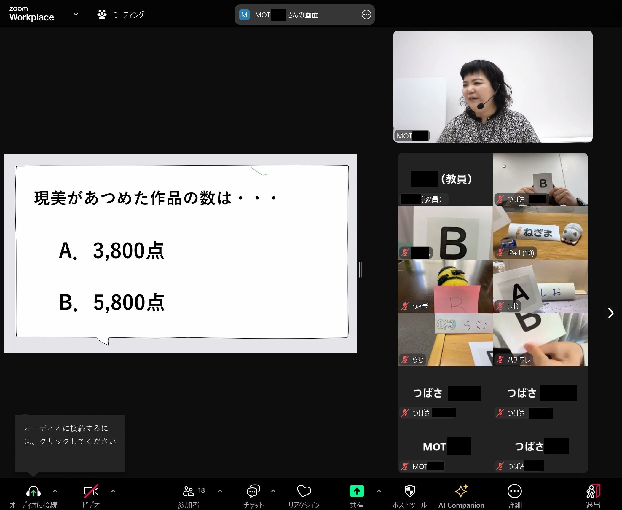 自己紹介が終わったら、クイズを交えた東京都現代美術館のご案内です。美術館スタッフが一方的に進行していくのではなく、参加してくれた皆さんとのコミュニケーションをもとに展開していきました。声を出しての参加が難しい場合は、手元に用意されたA/Bのカードを出して回答したり、近くにいる教員やお家の方が代理で紙に書いたものを画面に映して伝えてくれます。