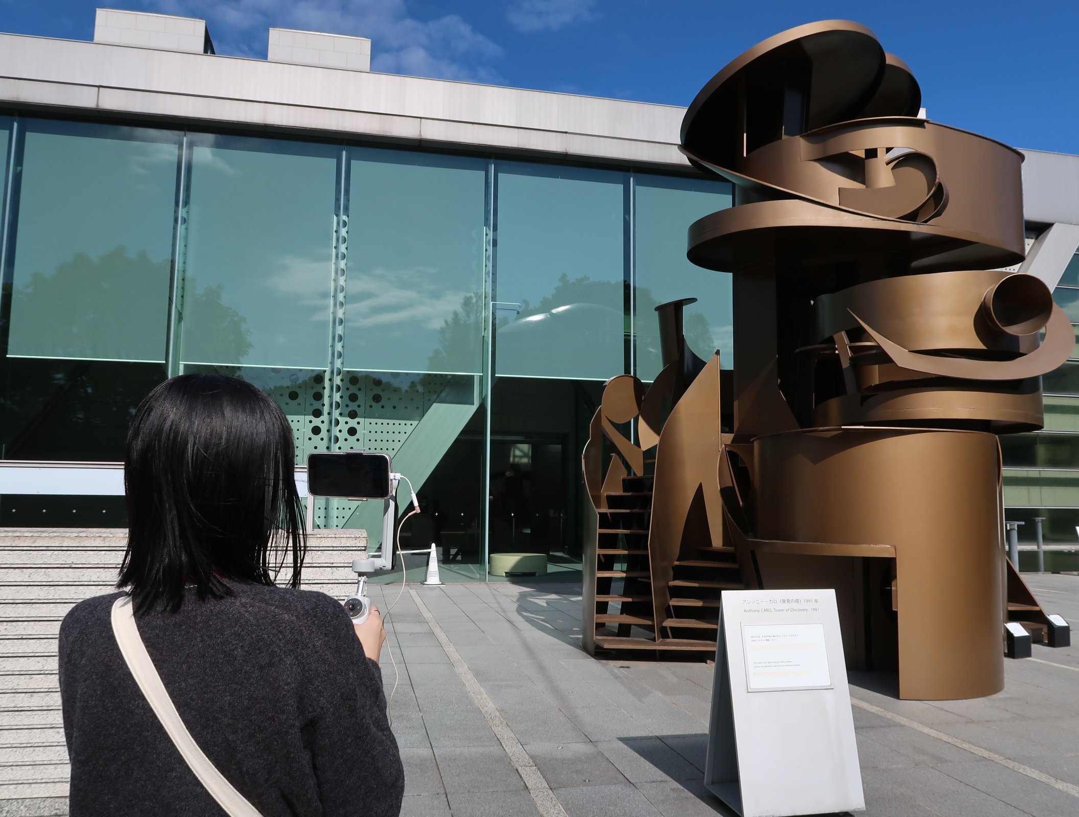 美術館にやってきた気分を少しでも味わえるよう、美術館の入り口から続く長いエントランスを起点に、展示室やミュージアムショップ、レストランからエントランスの突き当りに位置しているコレクション展までを写真を通してご紹介。「展示室の後は、屋外にあるコレクション作品を見に行きます」という言葉とともに、アンソニー・カロの《発見の塔》の前にいるスタッフのカメラに切り替わります。