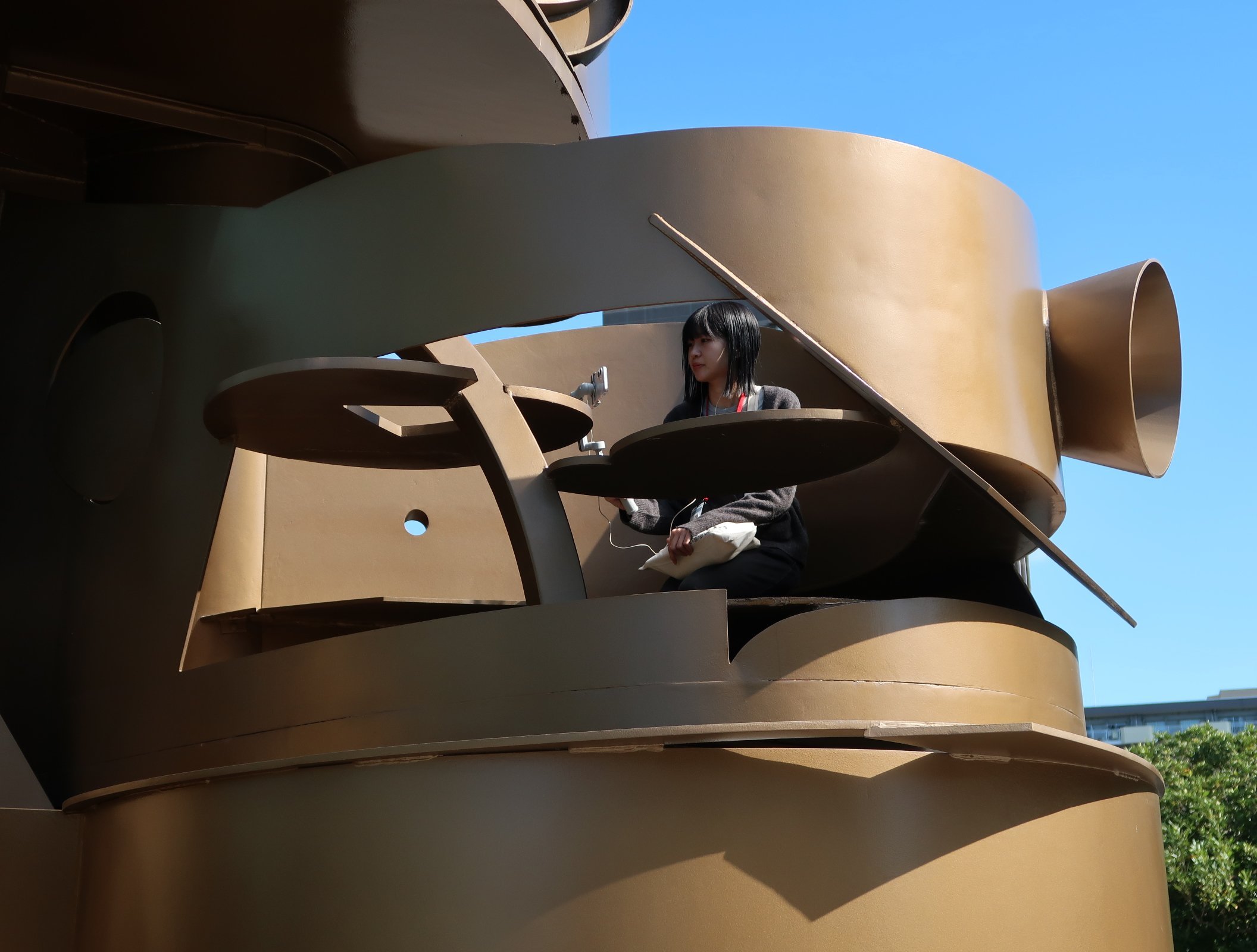 今年度の授業内容を考える先生との事前打ち合わせの場で「広い場所がない、刃物が使えないなどの制約があって、普段の授業ではなかなか立体作品の制作を行う機会がない」とのお話を伺い、当館公園口にそびえたつアンソニー・カロの彫刻作品《発見の塔》をテーマとした授業を実施することにしました。