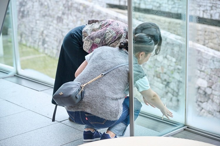 次に館内へ戻り、長さ140メートルあるエントランスの一部分(コレクション展側)で同様の活動を行います。要領が掴めてきたのか、参加者の皆さんは一目散に気になる場所へと向かい、各々の発見を記録していました。