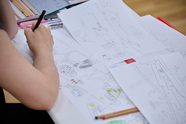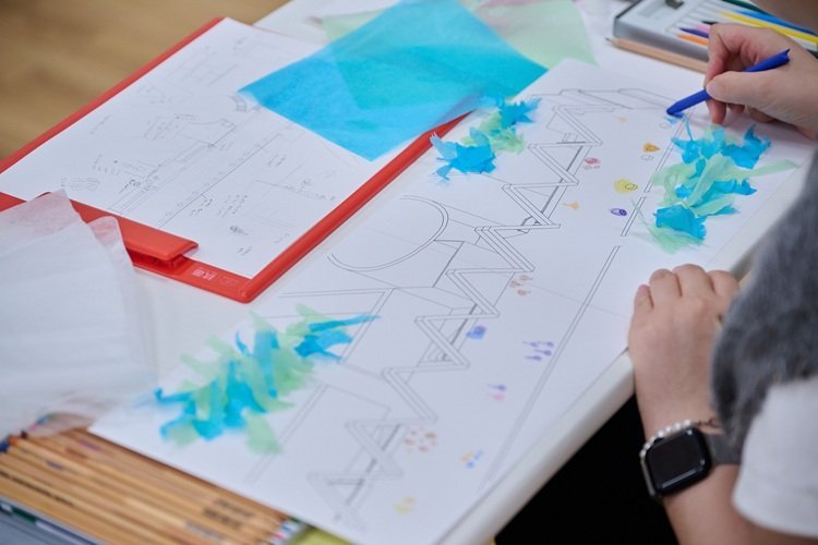 塩谷さんの図解作品は建築内部を詳細に描いているものですが、今回制作する「MOT図解」はひと味違うものを目指しました。空間の中、感覚で捉えた記憶を残すために、様々な素材を切り貼りして質感を再現したり、空気感を色に置き換えて塗ることで表現したり、オノマトペなどの言葉で書き表したり…。必ずしも描画することには拘らず、参加者自身の発想で表現していきます。