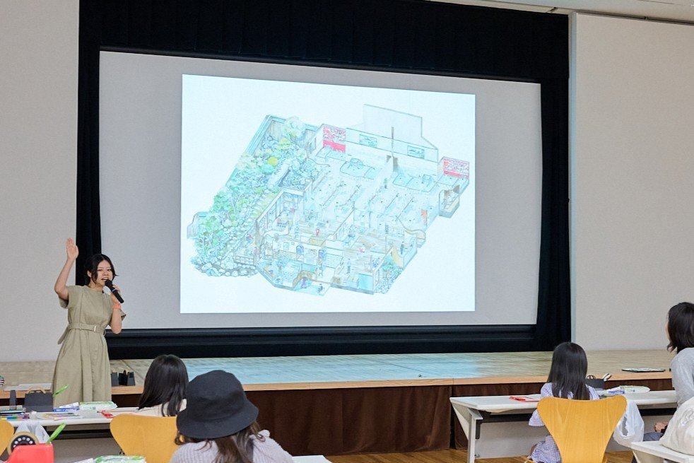 はじめに、塩谷さんから自己紹介がありました。塩谷さんは、アイソメトリックと呼ばれる建築図法を用いて建物の図解を描いています。これまでに描いた作品を画像で見せながら、描く際の工夫も教えてくださいました。